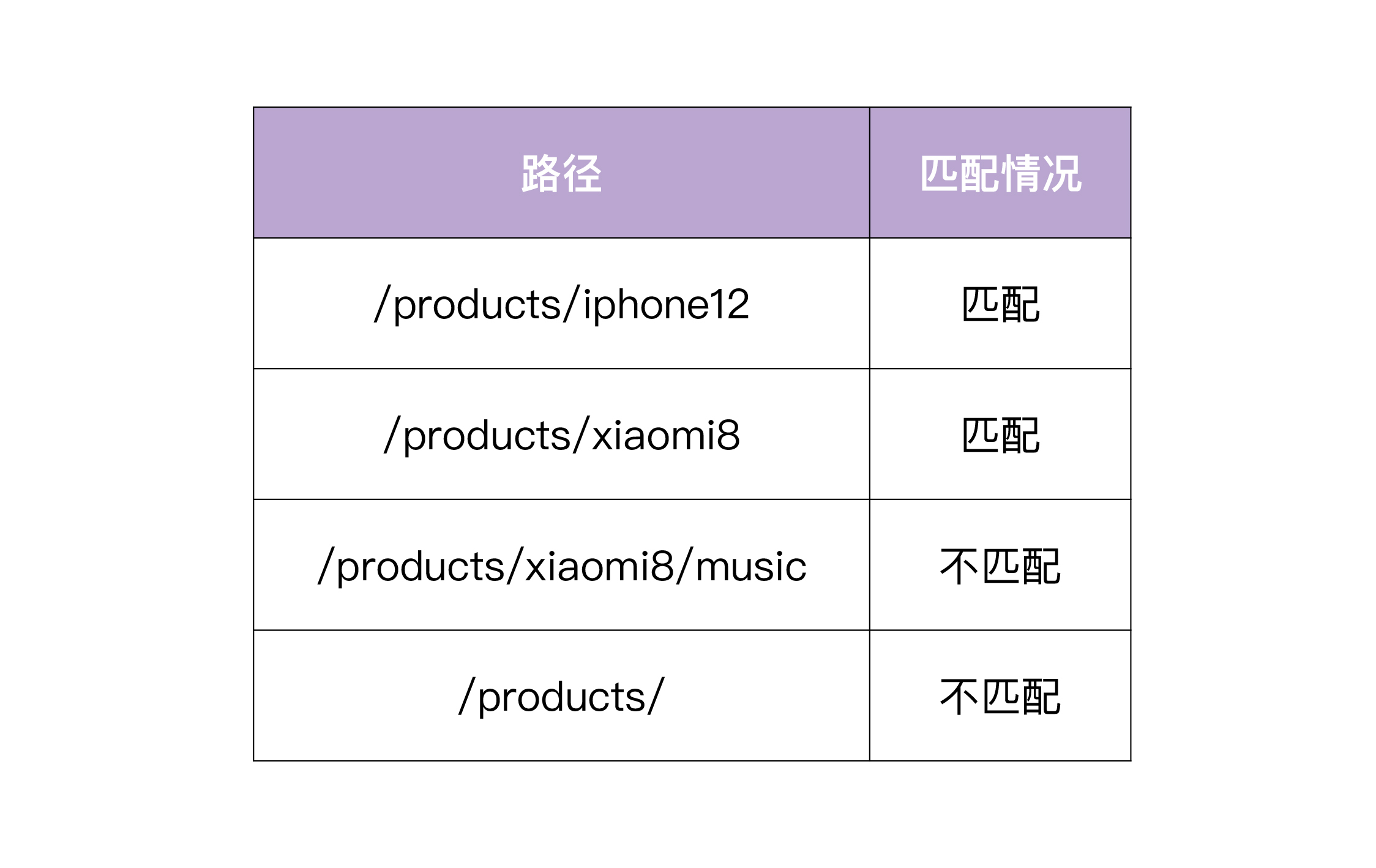 **第一种匹配规则是精确匹配。**例如,路由为/products/:name,匹配情况如下表所示: