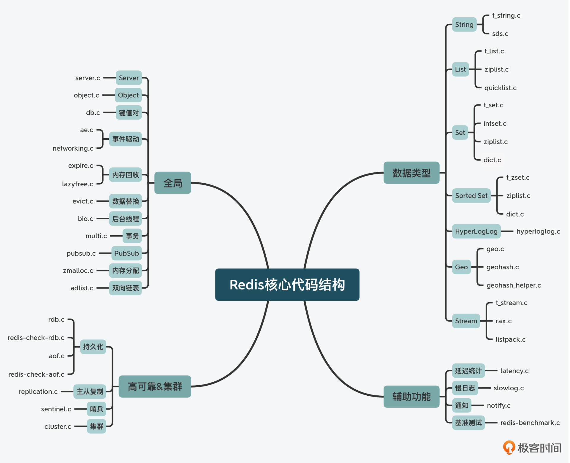 一切操作的基础,其实都是基于这些最常用的数据类型来做的,比如String、List、Hash、Set、Sorted Set等。所以,我们就可以从这些基础模块开始读起,也就是从t_string.c、t_list.c、t_hash.c、t_set.c、t_zset.c代码入手。