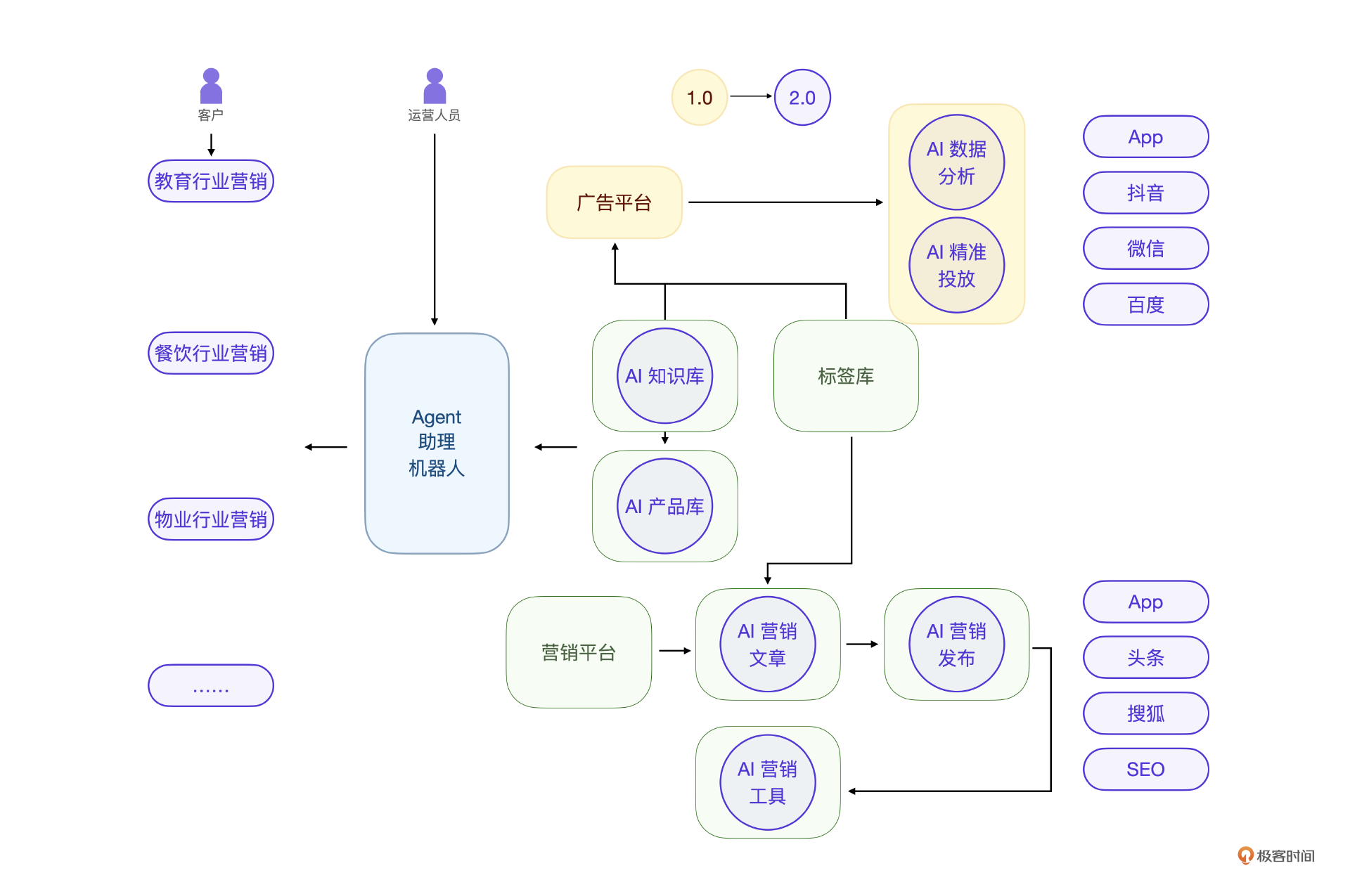 现在回到我们自己的开发方向上,经过半年的开发,我们回头才发现宝藏不就在原有的营销系统里吗?此时我们对AI的理解也足够了,定位也清晰了,正好Agent平台这种模式当时也在市场上出现了。