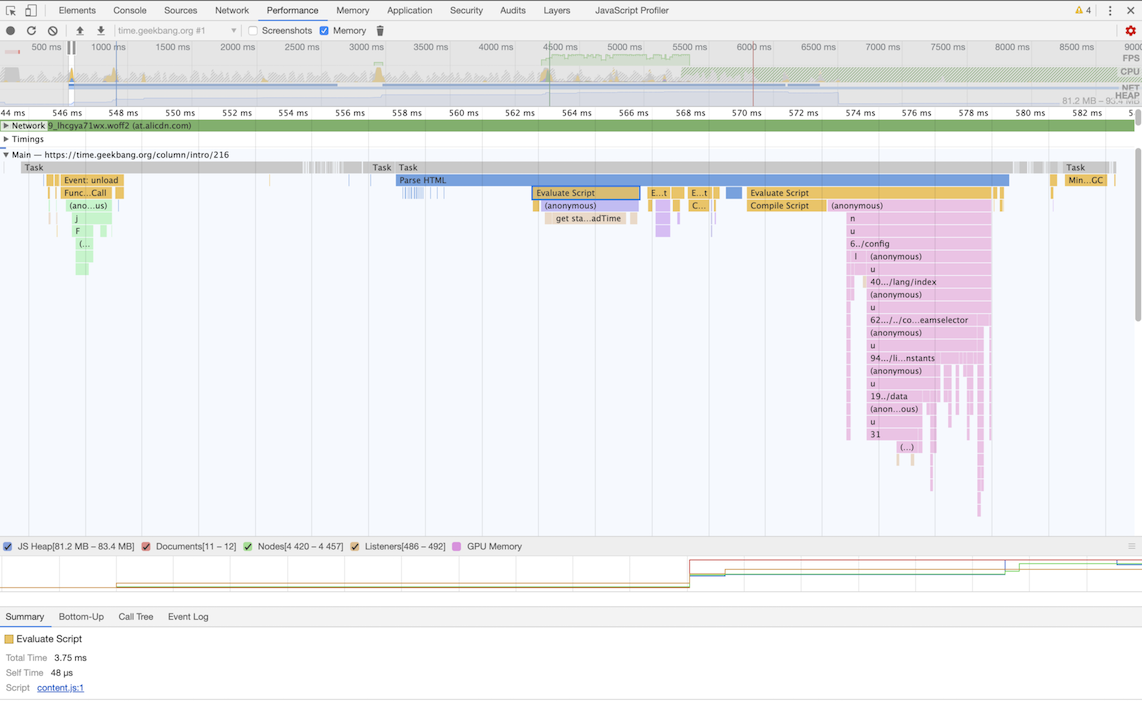 从图中可以看出,我们点击展开了Main这个项目,其记录了主线程执行过程中的所有任务。图中灰色的就是一个个任务,每个任务下面还有子任务,其中的Parse HTML任务,是把HTML解析为DOM的任务。值得注意的是,在执行Parse HTML的时候,如果遇到JavaScript脚本,那么会暂停当前的HTML解析而去执行JavaScript脚本。