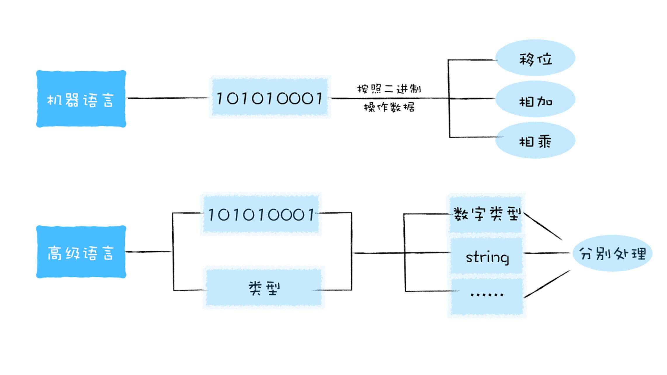 对机器语言来说,所有的数据都是一堆二进制代码,CPU处理这些数据的时候,并没有类型的概念,CPU所做的仅仅是移动数据,比如对其进行移位,相加或相乘。
