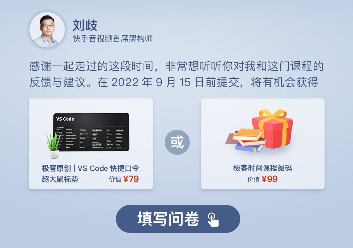 最后,文末有一份结课问卷,希望你可以花两分钟的时间填写一下。我会认真倾听你对这个专栏的意见或建议,期待你的反馈!