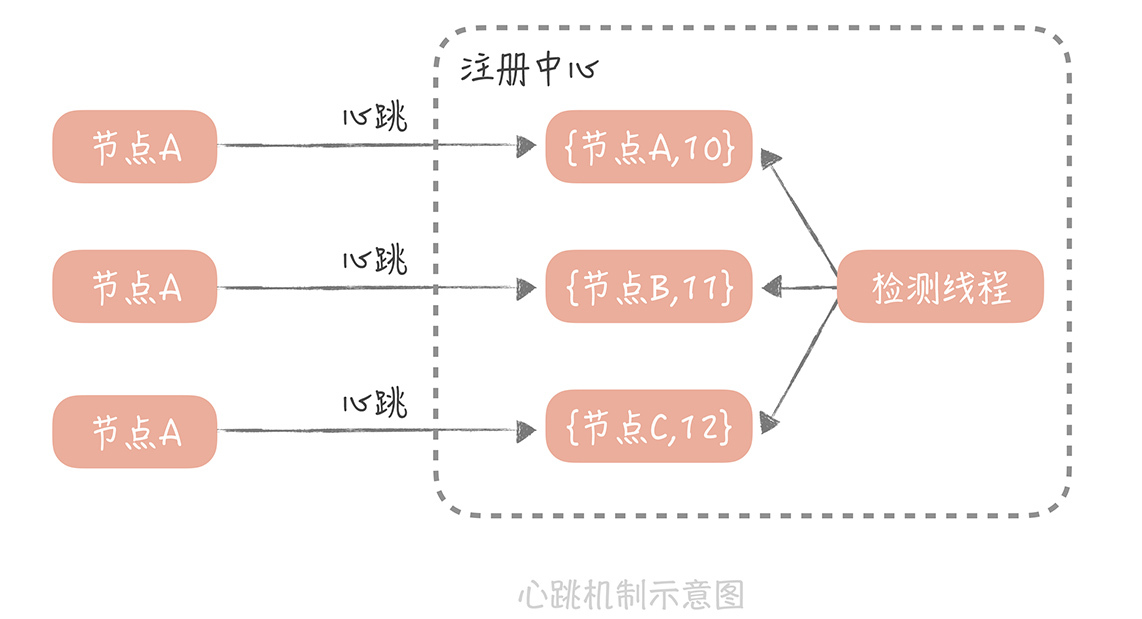 注册中心为每一个连接上来的RPC服务节点记录最近续约的时间,RPC服务节点在启动注册到注册中心后,就按照一定的时间间隔(比如30秒),向注册中心发送心跳包。注册中心在接收到心跳包之后,会更新这个节点的最近续约时间。然后,注册中心会启动一个定时器定期检测当前时间和节点最近续约时间的差值,如果达到一个阈值(比如说90秒),那么认为这个服务节点不可用。