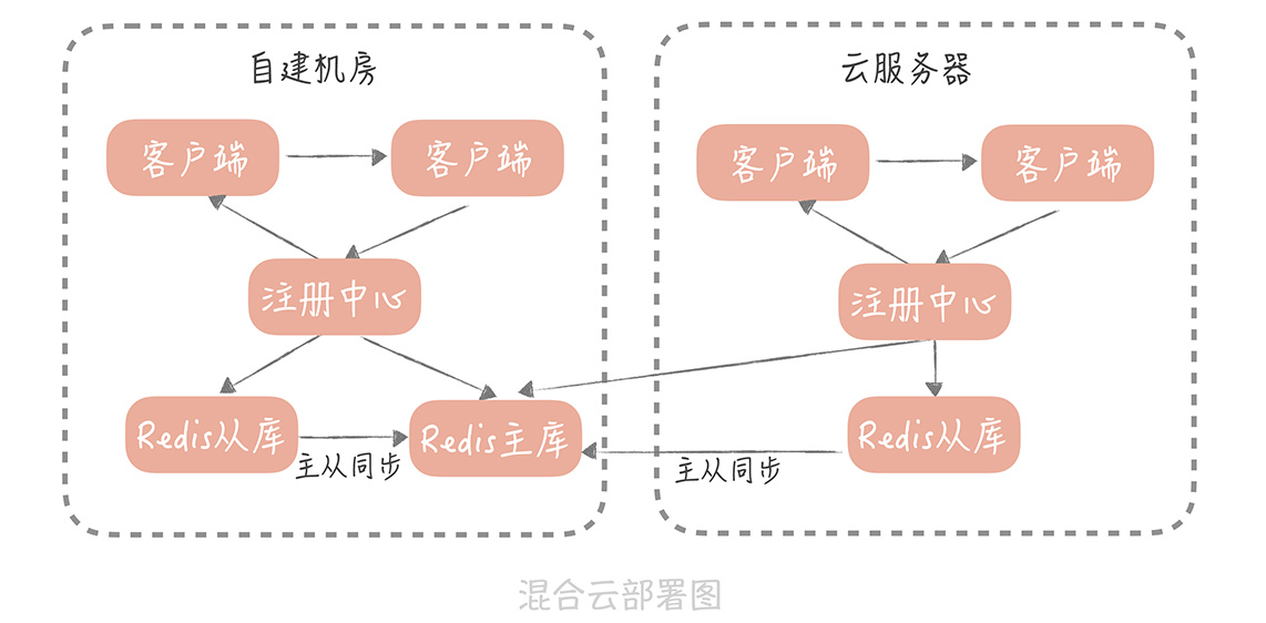 在正常的情况下,无论是自建机房,还是云服务器上的服务节点,都会向各自机房的注册中心注册地址信息,并且发送心跳。而这些地址信息以及服务的最近续约时间,都是存储在Redis主库中,各自机房的注册中心,会读各自机房的从库来获取最近续约时间,从而判断服务节点是否有效。