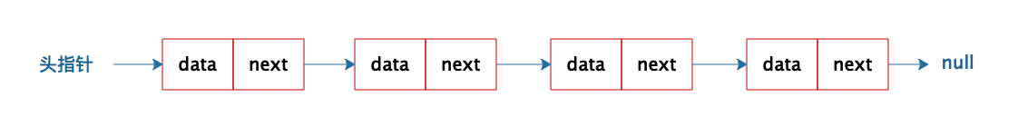 不同于数组必须要连续的内存空间,链表可以使用零散的内存空间存储数据。不过,因为链表在内存中的数据不是连续的,所以链表中的每个数据元素都必须包含一个指向下一个数据元素的内存地址指针。如下图,链表的每个元素包含两部分,一部分是数据,一部分是指向下一个元素的地址指针。最后一个元素指向null,表示链表到此为止。