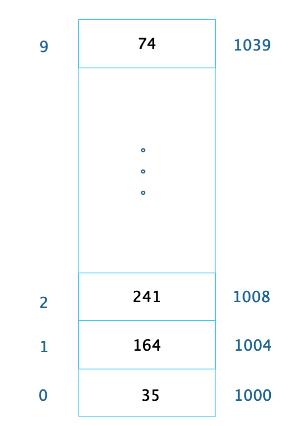 数组是最常用的数据结构,创建数组必须要内存中一块连续的空间,并且数组中必须存放相同的数据类型。比如我们创建一个长度为10,数据类型为整型的数组,在内存中的地址是从1000开始,那么它在内存中的存储格式如下。