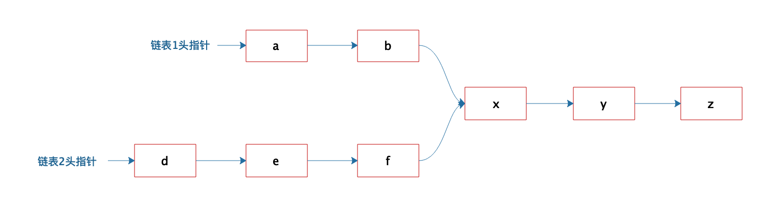 有两个单向链表,这两个单向链表有可能在某个元素合并,如下图所示的这样,也可能不合并。现在给定两个链表的头指针,如何快速地判断这两个链表是否合并?如果合并,找到合并的元素,也就是图中的x元素。