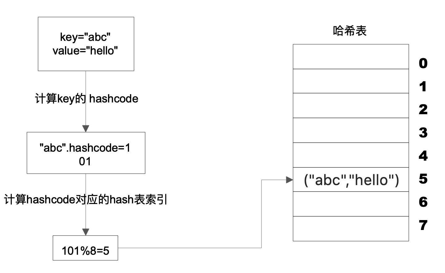 上图这个例子中,Key是字符串abc,Value是字符串hello。我们先计算Key的哈希值,得到101这样一个整型值。然后用101对8取模,这个8是哈希表数组的长度。101对8取模余5,这个5就是数组的下标,这样就可以把(“abc”,“hello”)这样一个Key、Value值存储在下标为5的数组记录中。