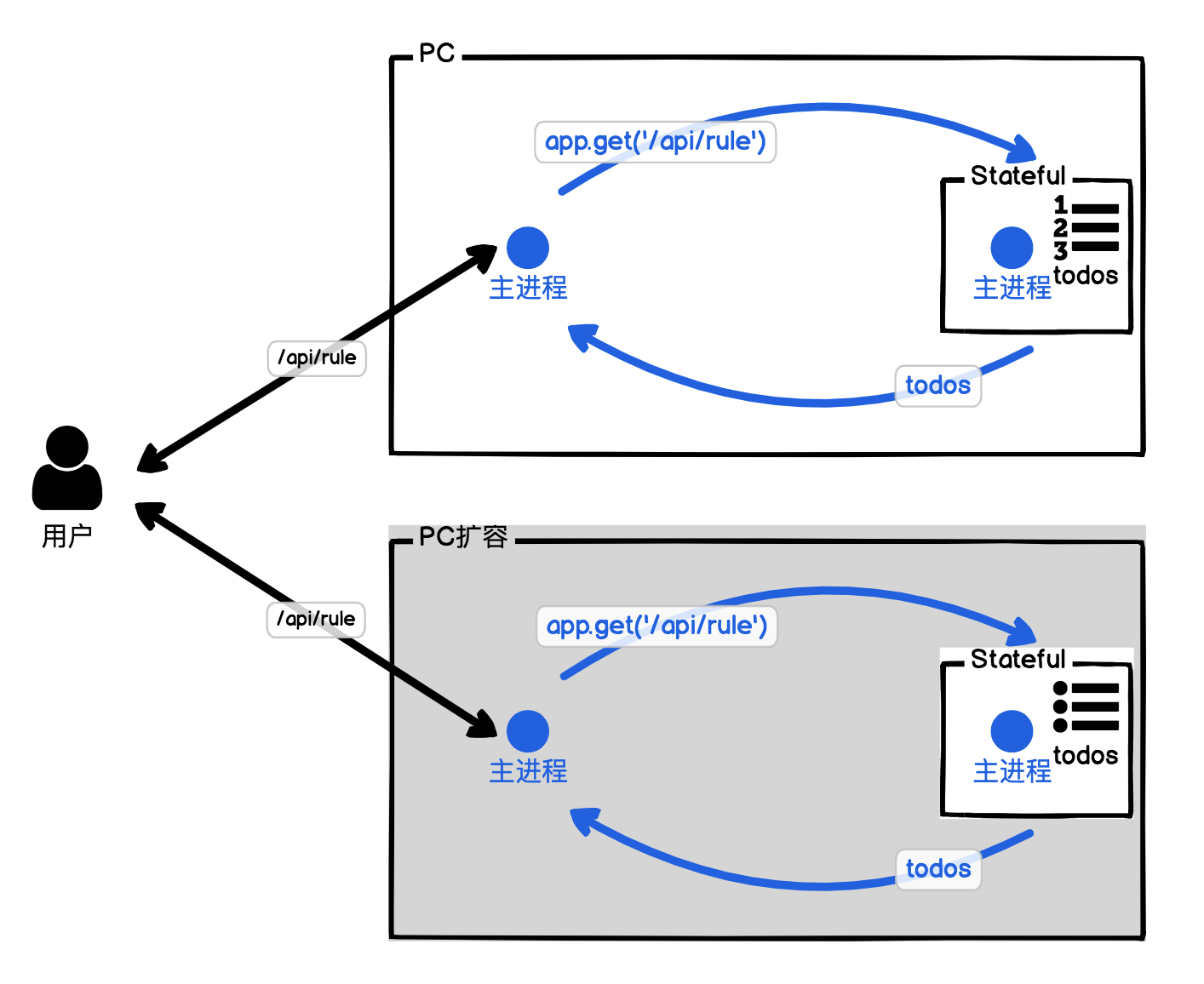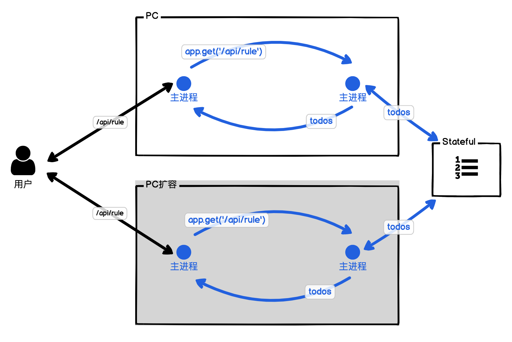 回到我们的进程模型,用完即毁型是天然的Stateless,因为它执行完就销毁,你无法单纯用它持久化存储任何值;常驻进程型则是天然的Stateful,因为它的主进程不退出,主进程可以存储部分值。