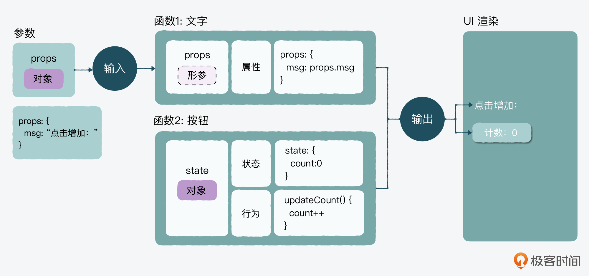 在上面这个图例中,有一个静态的文案和一个动态的计数器。其中,props就是“点击增加:”这个文案,它在页面上基本是不应该有什么变化的,就是一句固定的提示语,所以它就是props,一个静态的“属性”。