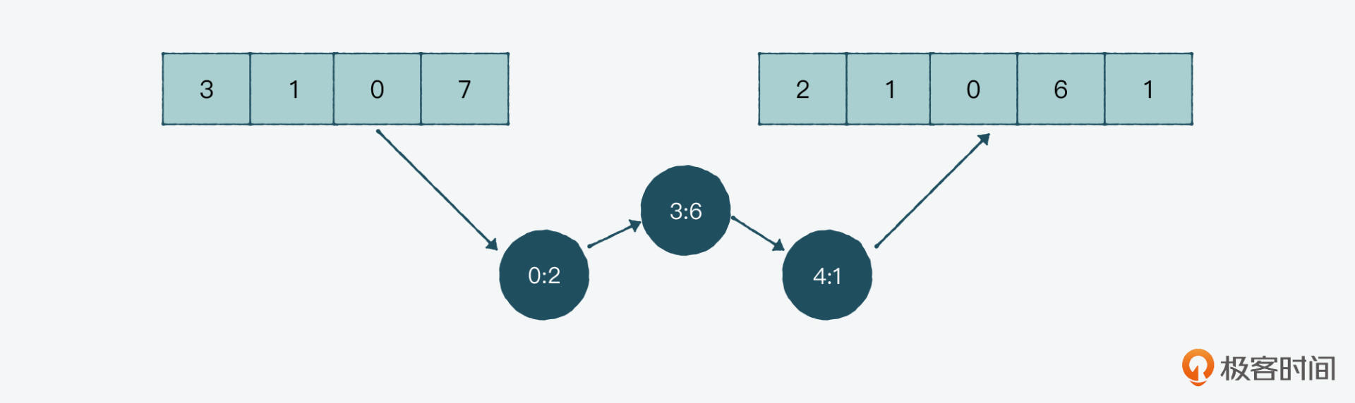 比如下面的 [3, 1, 0, 7] 这组数组中,我们把第0个值变成2,第3个值变成6,第4个值添加1,形成了 [2, 1, 0, 6, 1]。那么如果我们只记录变化的话,就是0:2、3:6和4:1这三组对象,是不是就减少了很多内存占用?