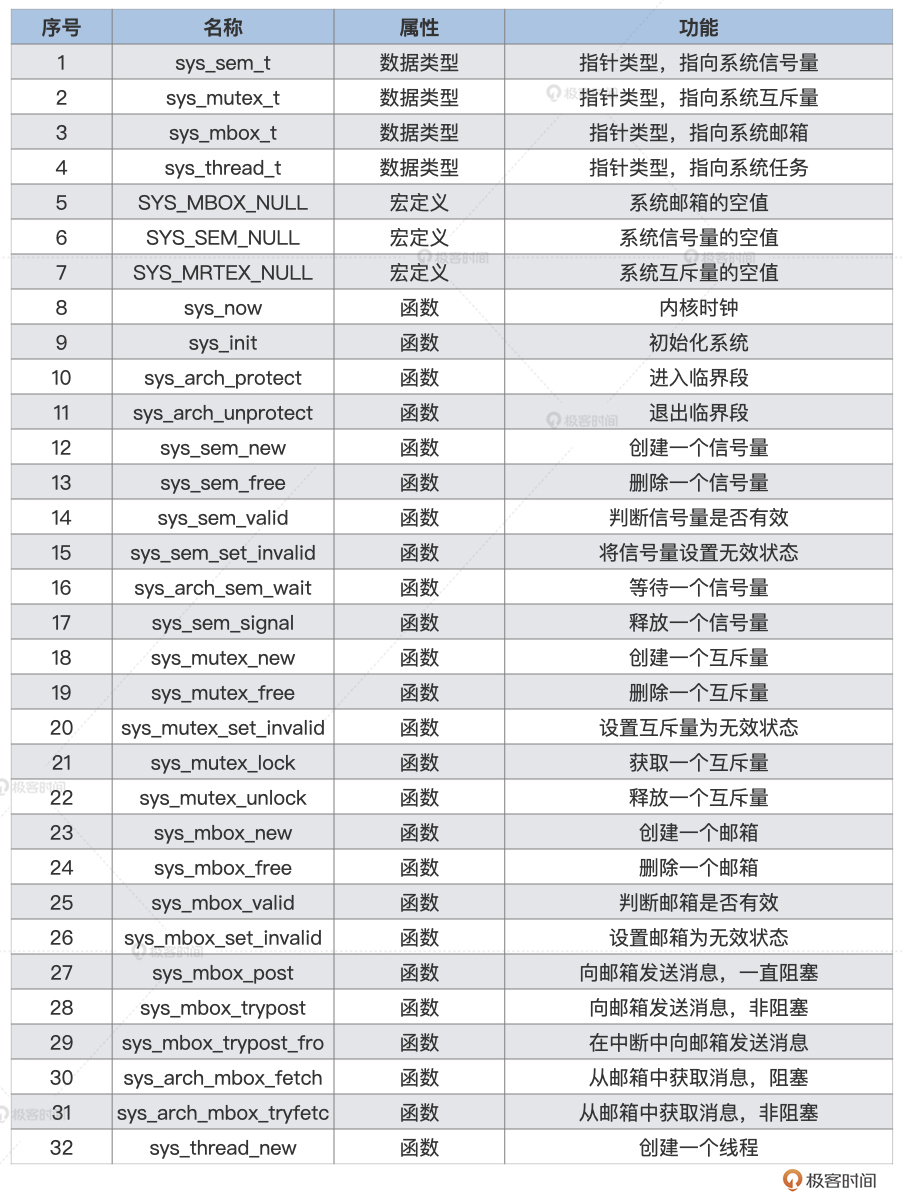实际工程中完整移植网络栈,需要将后面表格里的这30多个函数全部实现。我会带你完成邮箱和系统线程相关的关键部分移植,其他函数的移植思路也大同小异,这里就不一一演示了。