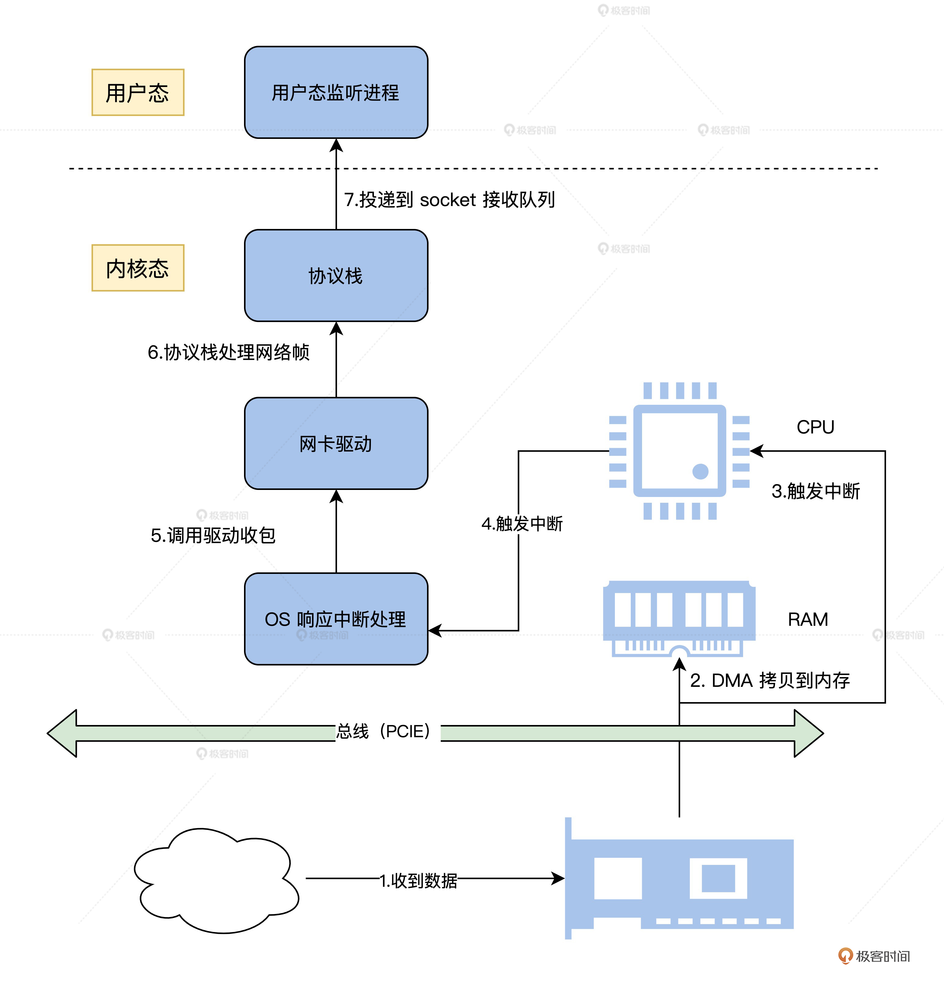 首先,网卡接收到数据,通过DMA复制到指定的内存,接着发送中断,以便通知网卡驱动,由网卡驱动处理中断复制数据。然后网络协议收到网卡驱动传过来的数据,层层解包,获取真正的有效数据。最后,这个数据会发送给用户态监听的应用进程。