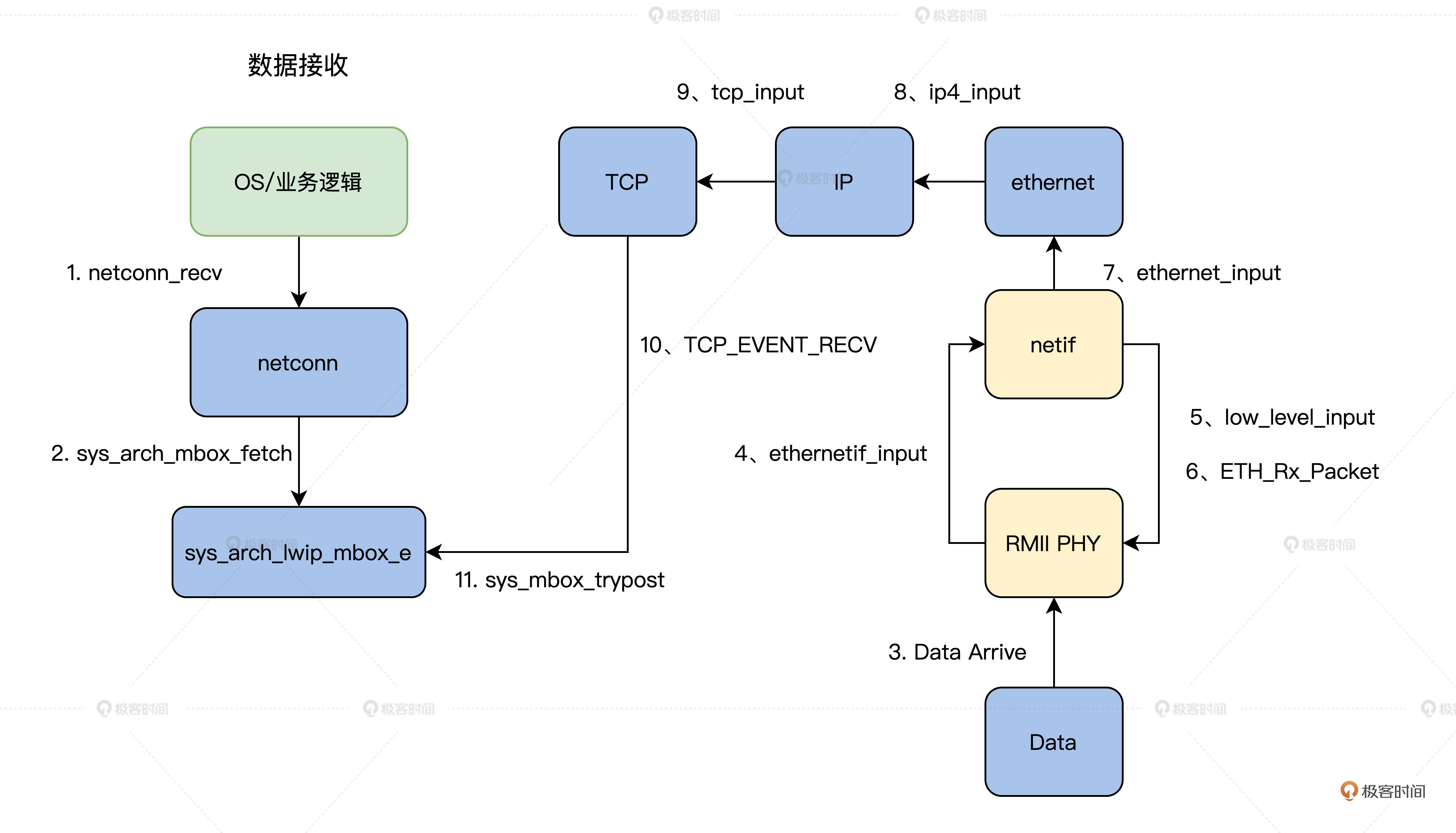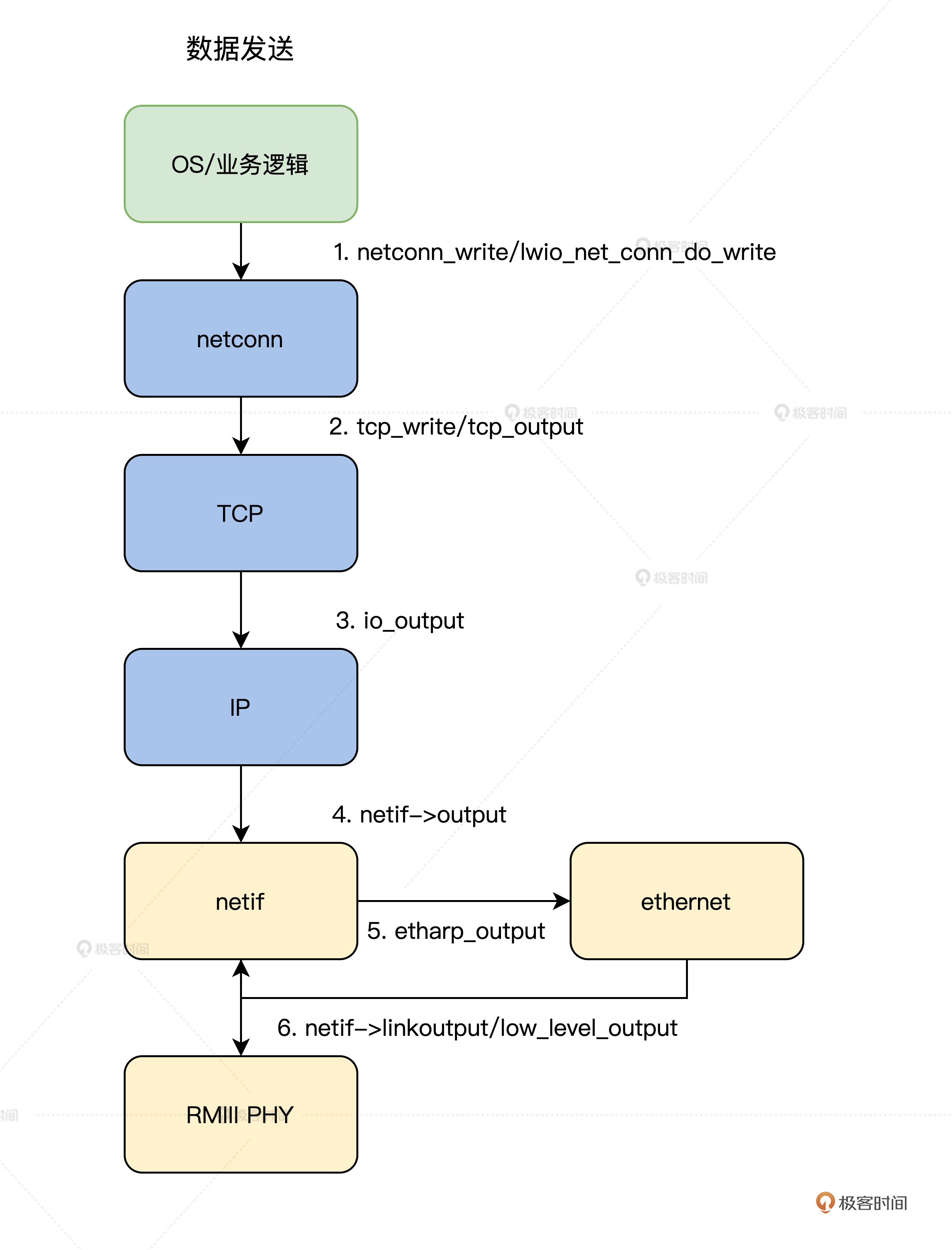 接下来,让我们顺着之前的思路来对应到lwIP在收发过程中的核心函数,具体过程我同样梳理了流程图。你可以结合图里关键的函数名以及步骤顺序,按这个顺序在IwIP代码中检索阅读。