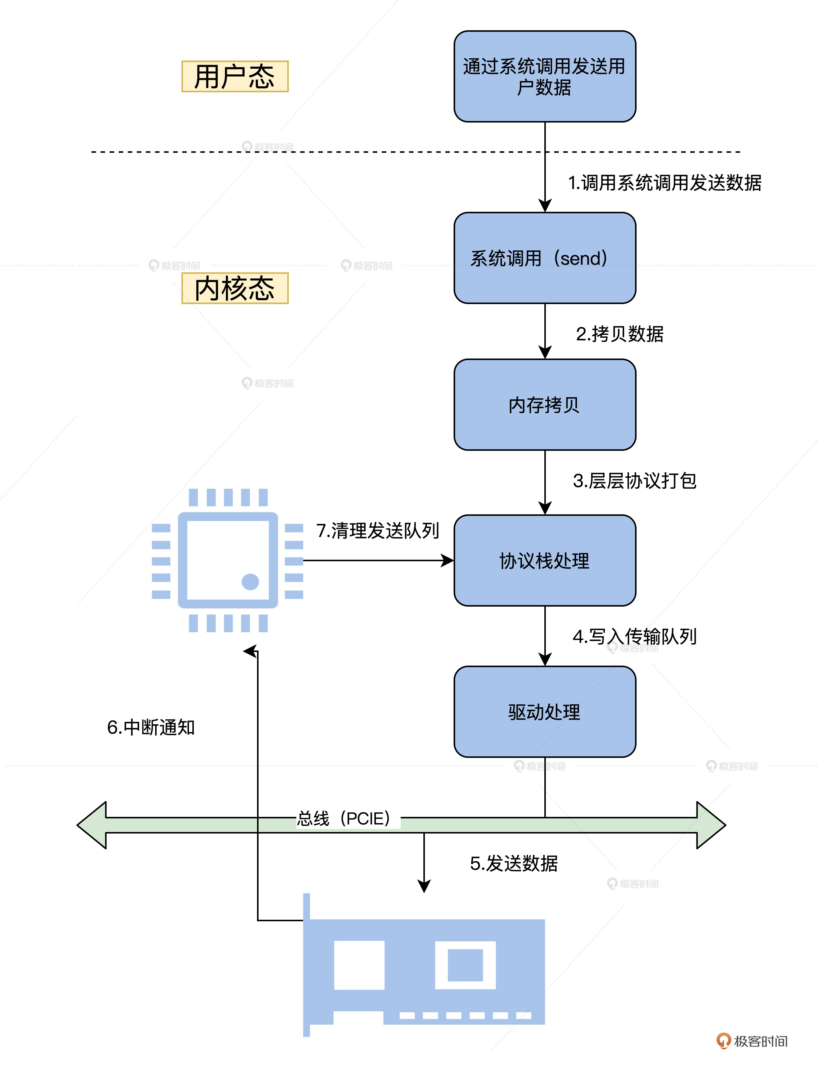 应用程序首先会准备好数据,调用用户态下的库函数。接着调用系统API接口函数,进入到内核态。