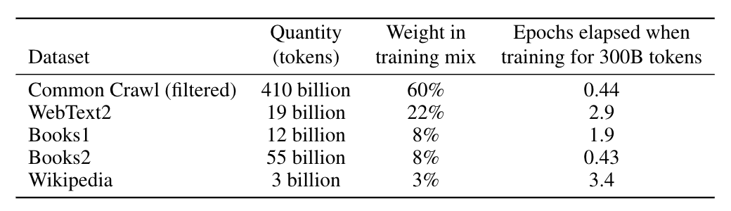 首先,我向你介绍下基础模型GPT-3的训练数据集。GPT-3模型具有1750亿个参数,训练数据集大约500B个token(1B=1 billion,也就是10亿)。下面是训练数据大概的组成结构: