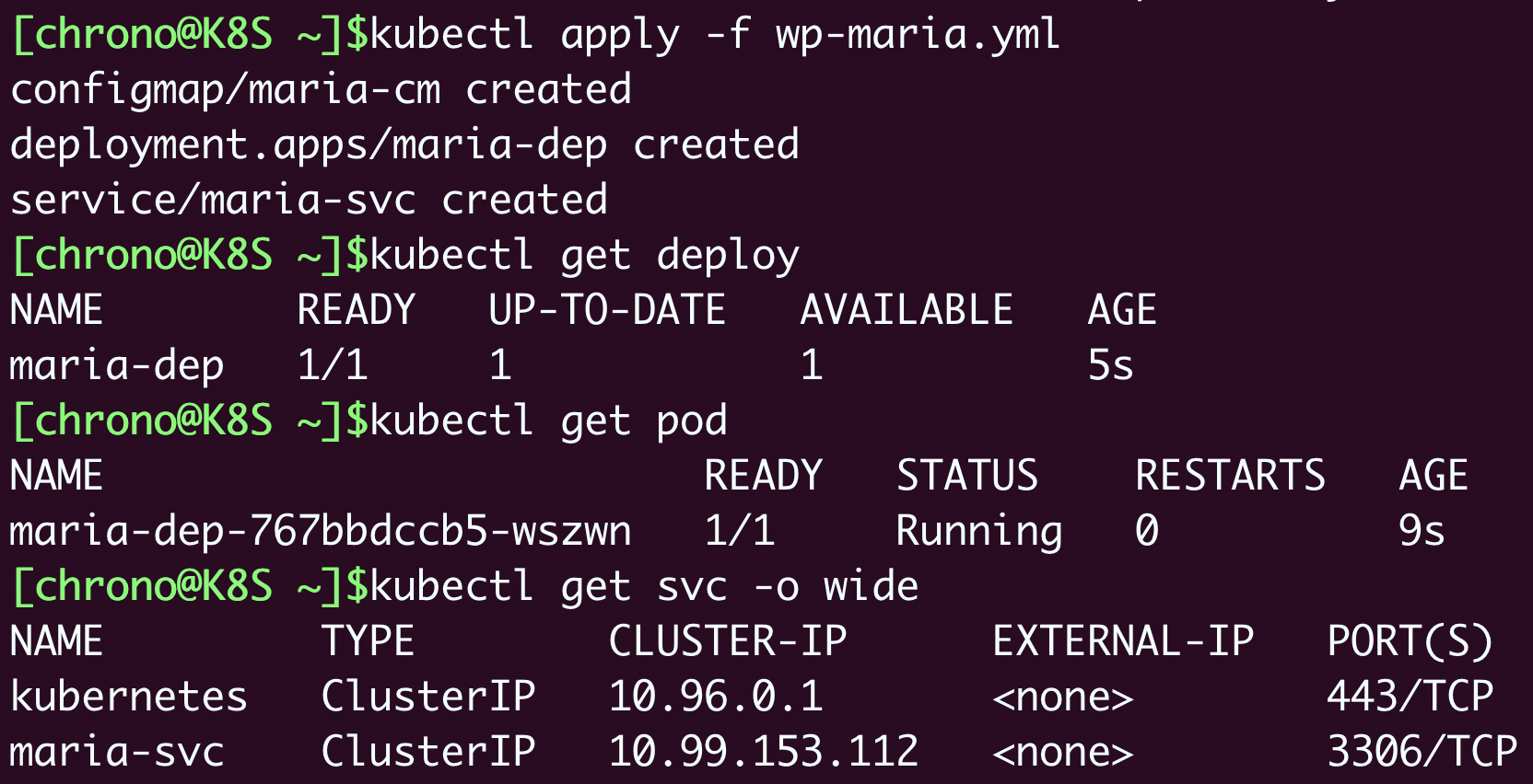 我们还需要再为MariaDB定义一个Service对象,映射端口3306,让其他应用不再关心IP地址,直接用Service对象的名字来访问数据库服务: