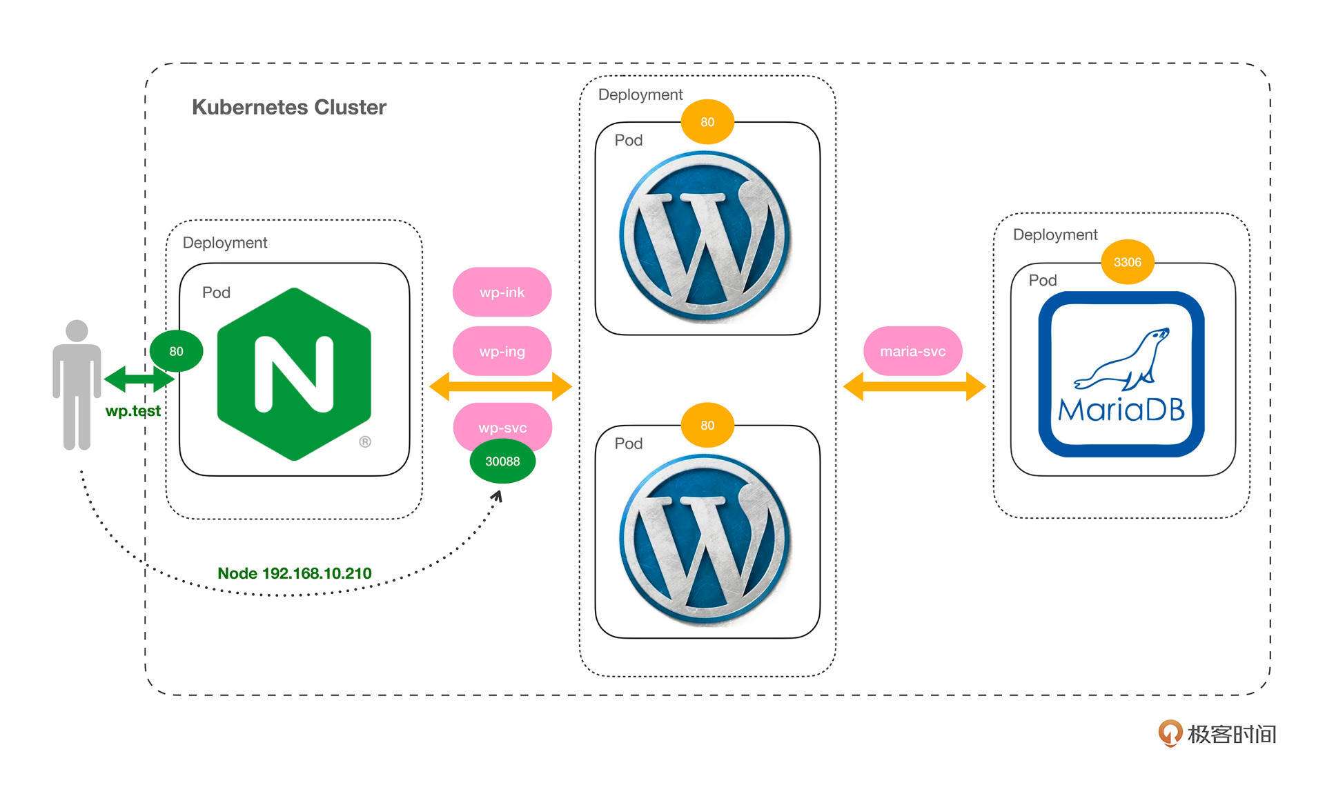 下面我先梳理一下“中级篇”里讲过的Kubernetes知识要点,然后是实战演示,搭建WordPress网站。当然这次比前两次又有进步,不用Docker,也不用裸Pod,而是用我们新学习的Deployment、Service、Ingress等对象。