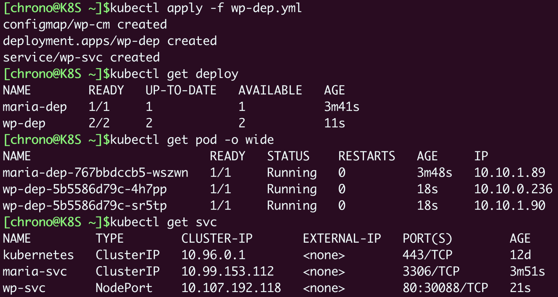 还有,因为Kubernetes内置了服务发现机制Service,我们再也不需要去手动查看Pod的IP地址了,只要为它们定义Service对象,然后使用域名就可以访问MariaDB、WordPress这些服务。