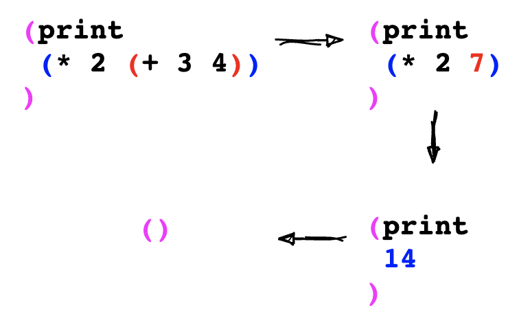 对一个 “S-表达式” 的求值会从最内层的括号表达式开始。比如对于上述的 Lisp 代码,我们会首先计算其最内层表达式 “(+ 3 4)” 的值。计算完毕后,该括号表达式的位置会由该表达式的计算结果进行替换。以此类推,从内到外,最后计算出整个表达式的值。当然,除了求值,对于诸如 print 函数来说,也会产生一些如“与操作系统 IO 进行交互”之类的副作用(Side Effect)。
