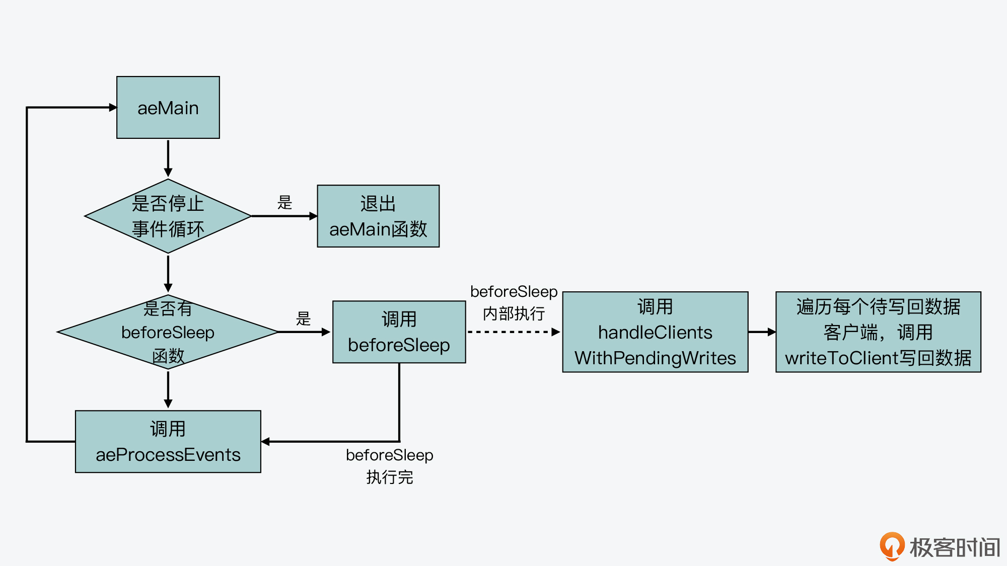 好了,我们刚才了解的是读写事件对应的回调处理函数。实际上,为了能及时处理这些事件,Redis事件驱动框架的aeMain函数还会循环调用aeProcessEvents函数,来检测已触发的事件,并调用相应的回调函数进行处理。