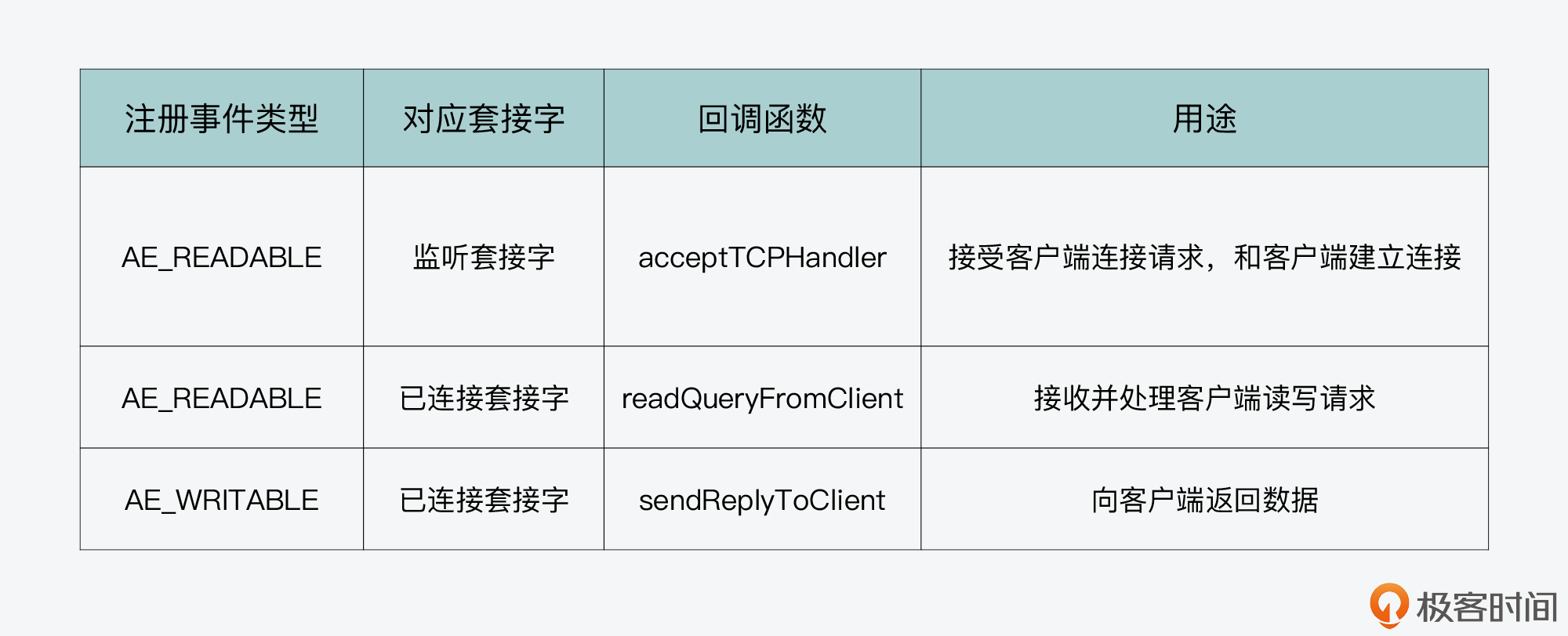 而当实例需要向客户端写回数据时,实例会在事件驱动框架中注册可写事件,并使用sendReplyToClient作为回调函数,将缓冲区中数据写回客户端。我总结了一张表格,以便你再回顾下IO事件和相应套接字、回调函数的对应关系。