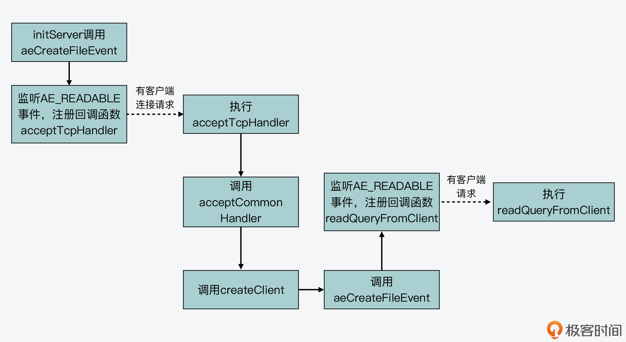 了解了这些代码后,我们可以学习到事件驱动框架是如何基于epoll,封装实现了IO事件的创建。那么,在Redis server启动运行后,最开始监听的IO事件是可读事件,对应于客户端的连接请求。具体是initServer函数调用了aeCreateFileEvent函数,创建可读事件,并设置回调函数为acceptTcpHandler,用来处理客户端连接。这部分内容,你也可以再回顾下第10讲。