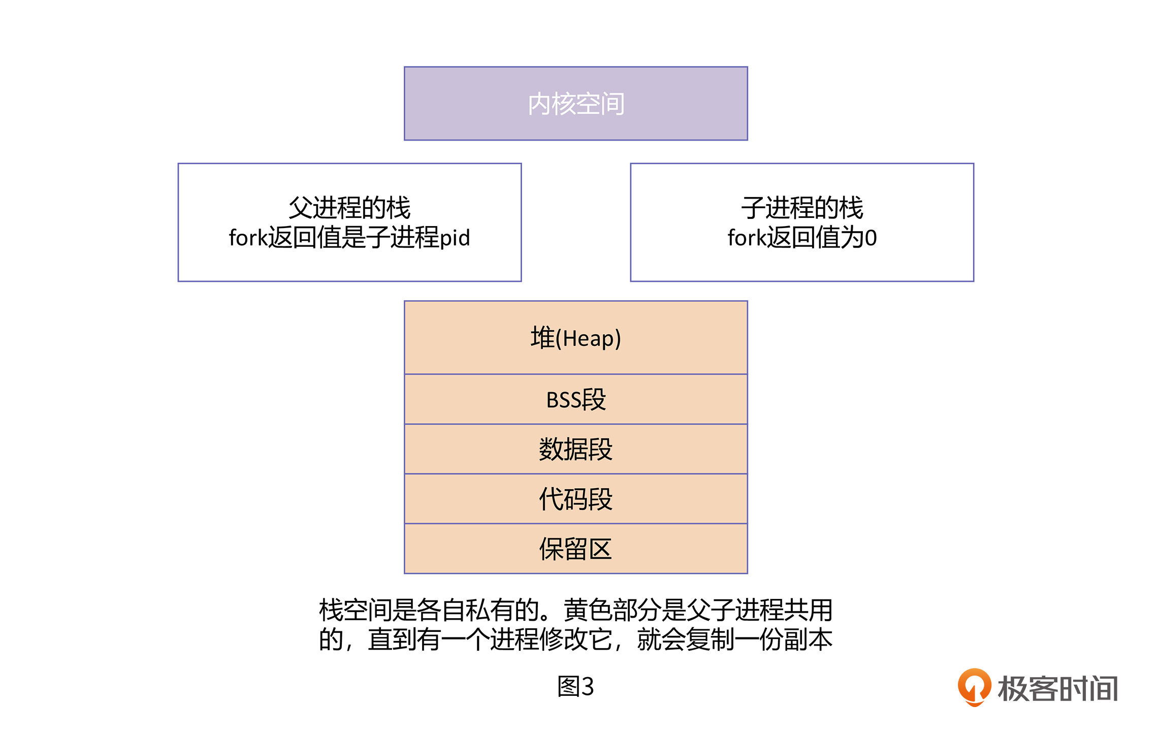 在图3里,只要有一个进程对栈进行修改,栈就会复制一份,然后父子进程各自持有一份。图中的黄色部分也是进程共用的,如果有一个进程修改它,也会复制一份副本,这种机制叫做写时复制。