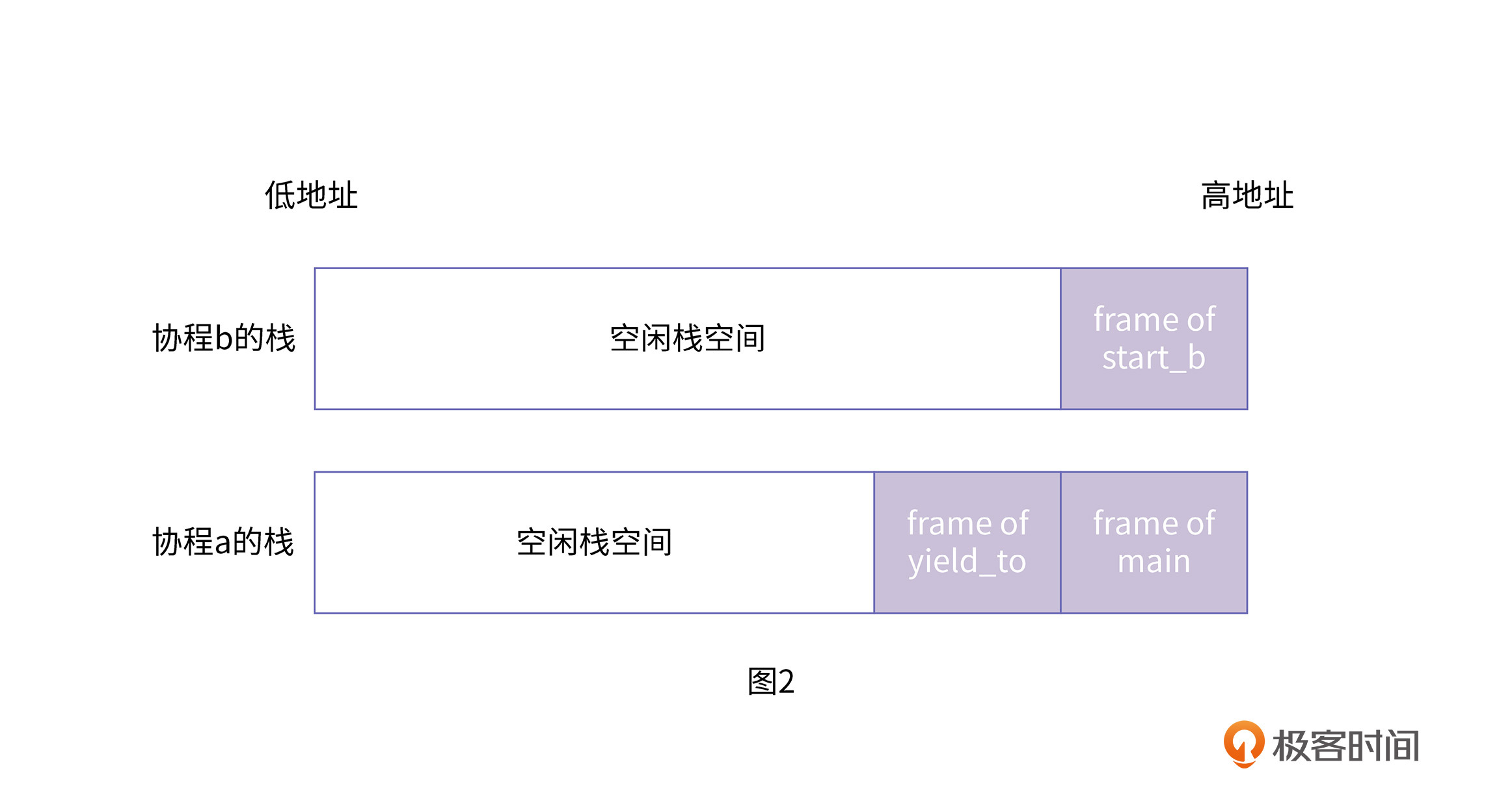 你可以看到,在main函数的执行过程中(即代码的57行),CPU通过执行yield_to方法转到另外一个协程。新的协程的入口函数是start_b,所以,CPU就转而去执行start_b,在start_b执行到48行的时候,还能再通过yield_to,再回到main函数中继续执行。