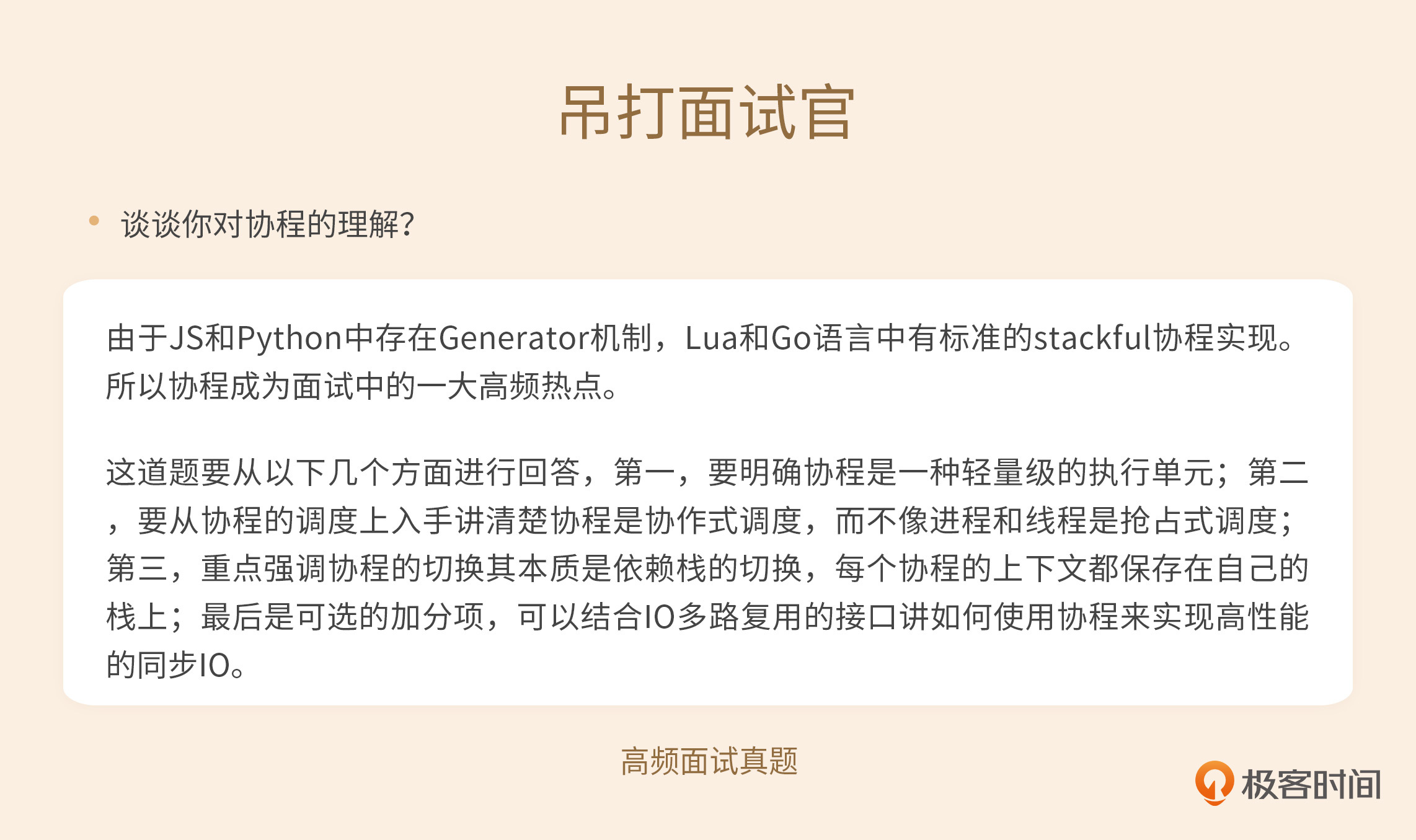 但我们这节课却要先讲协程,这是因为从实现层面来说,协程是最简单的,当你理解了协程的实现原理,再回头学习进程就比较容易了,所以我们先来学习协程的原理。