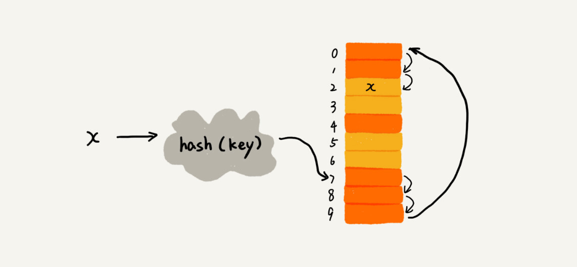 从图中可以看出,散列表的大小为10,在元素x插入散列表之前,已经6个元素插入到散列表中。x经过Hash算法之后,被散列到位置下标为7的位置,但是这个位置已经有数据了,所以就产生了冲突。于是我们就顺序地往后一个一个找,看有没有空闲的位置,遍历到尾部都没有找到空闲的位置,于是我们再从表头开始找,直到找到空闲位置2,于是将其插入到这个位置。