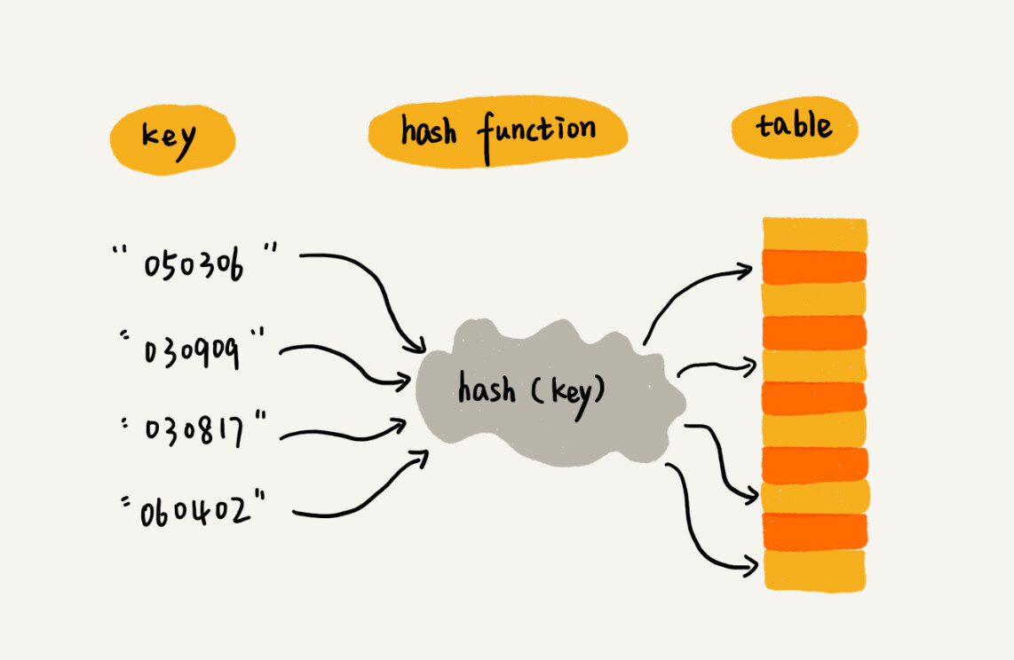 通过这个例子,我们可以总结出这样的规律:散列表用的就是数组支持按照下标随机访问的时候,时间复杂度是O(1)的特性。我们通过散列函数把元素的键值映射为下标,然后将数据存储在数组中对应下标的位置。当我们按照键值查询元素时,我们用同样的散列函数,将键值转化数组下标,从对应的数组下标的位置取数据。