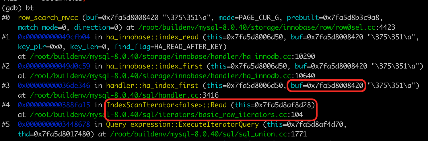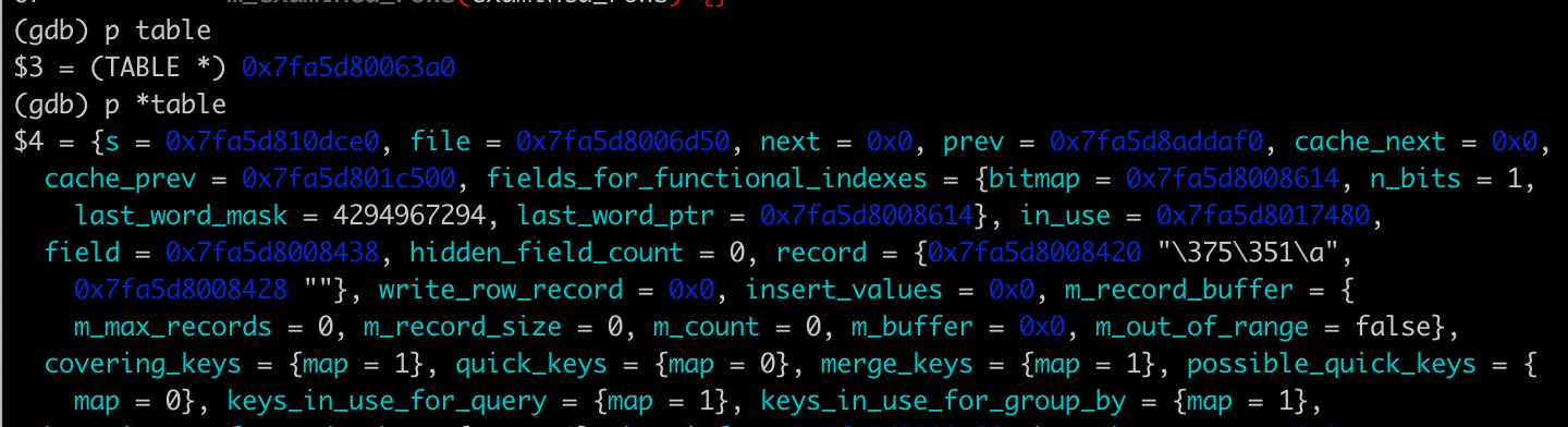 好了,这个调试案例就先到这儿。借助GDB,我们分析了一个简单的SELECT语句执行的基本步骤,我们还知道了MySQL Server层和InnoDB存储引擎之间,是通过TABLE结构体的record buffer来传递数据的。