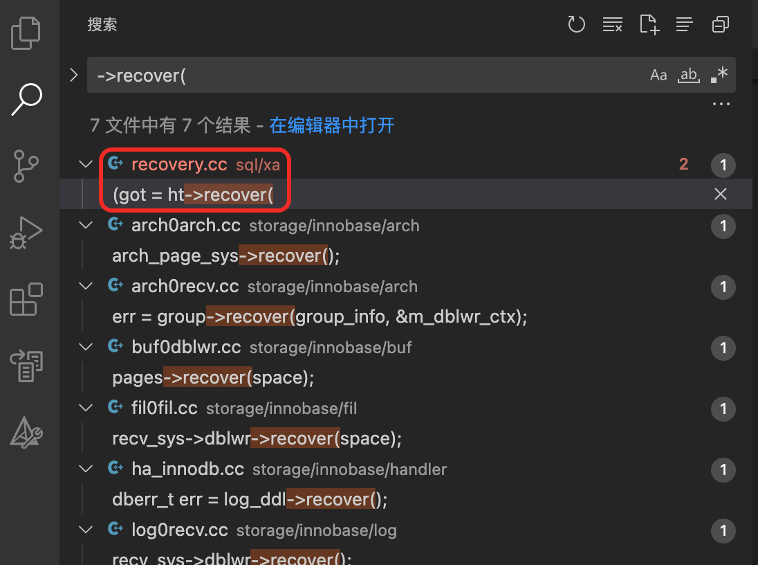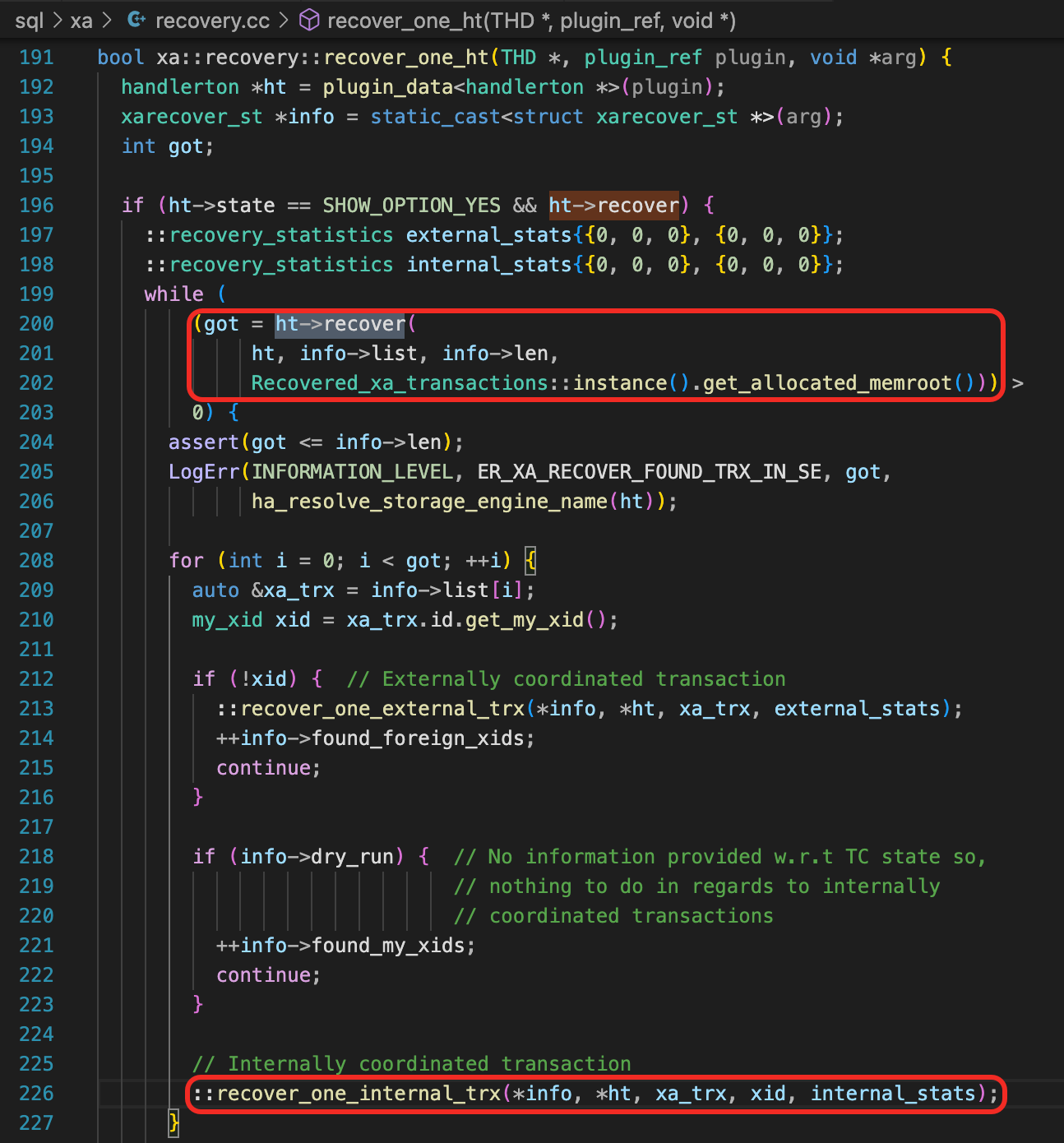 你可以试着查一下hton->recover在哪里调用。直接搜索innobase_hton->recover或hton->recover找不到调用的地方,因为在调用的地方,变量名不是innobase_hton或hton。改成搜索“->recover(”,可以找到调用的地方。