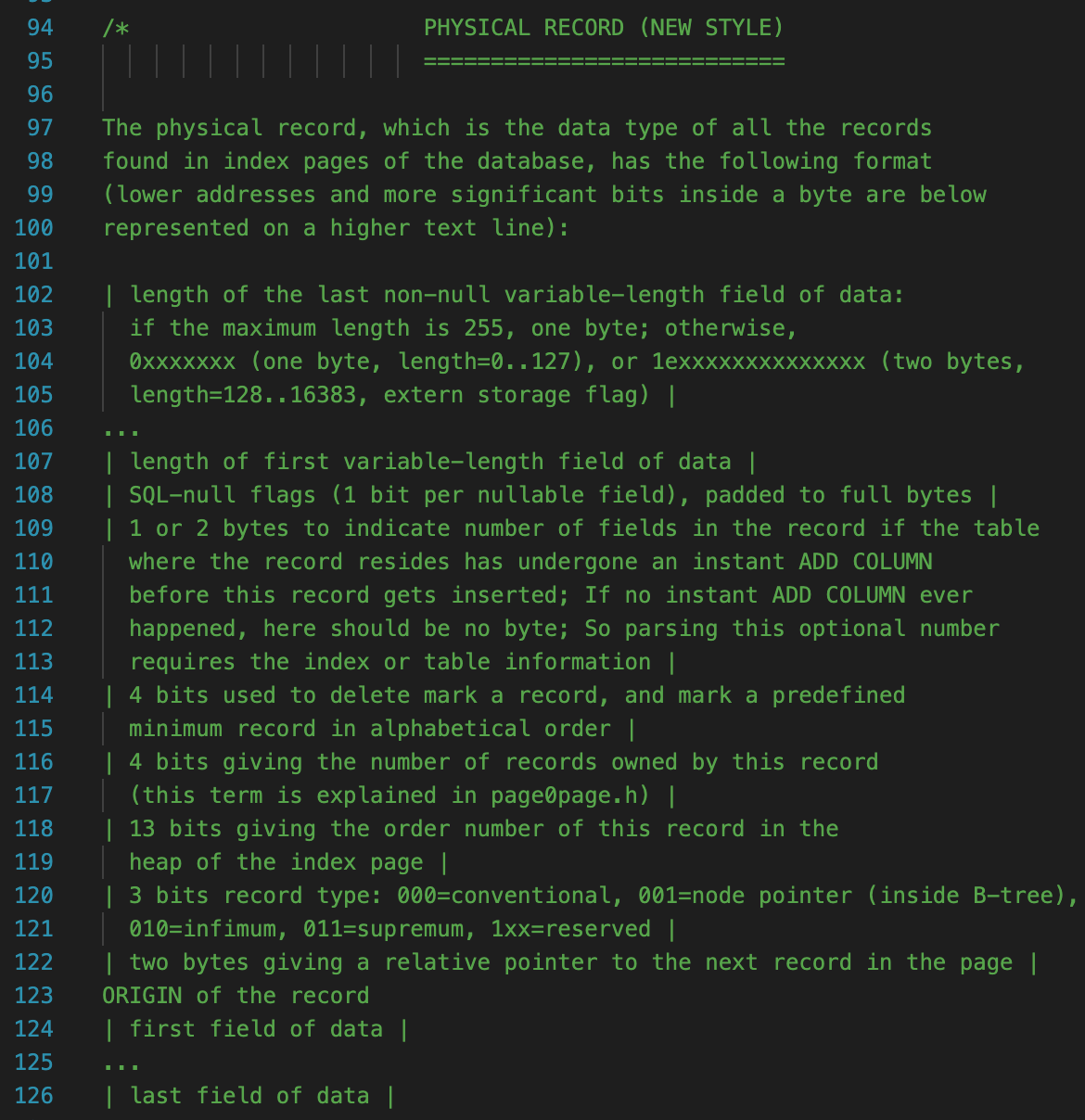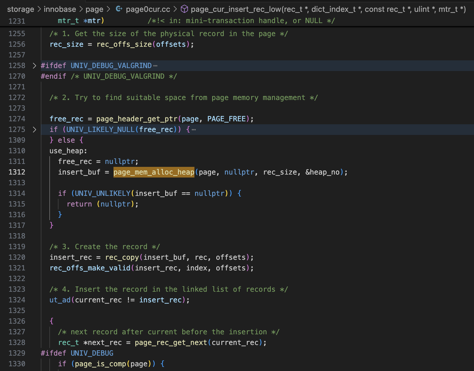 再搜索page_mem_alloc_heap,发现这个函数在insert时被调用(page0cur.cc page_cur_insert_rec_low),然后就可以看到insert的记录是怎么写到数据块中了(参考page_cur_insert_rec_low中标了编号的几行代码注释)。