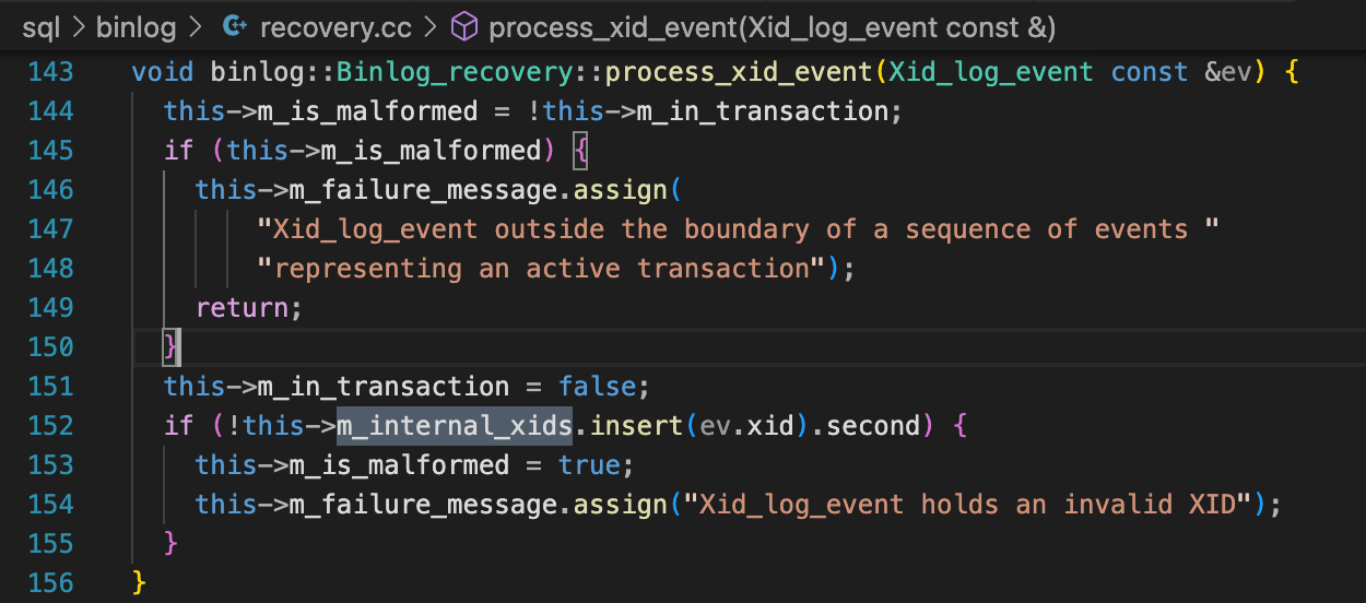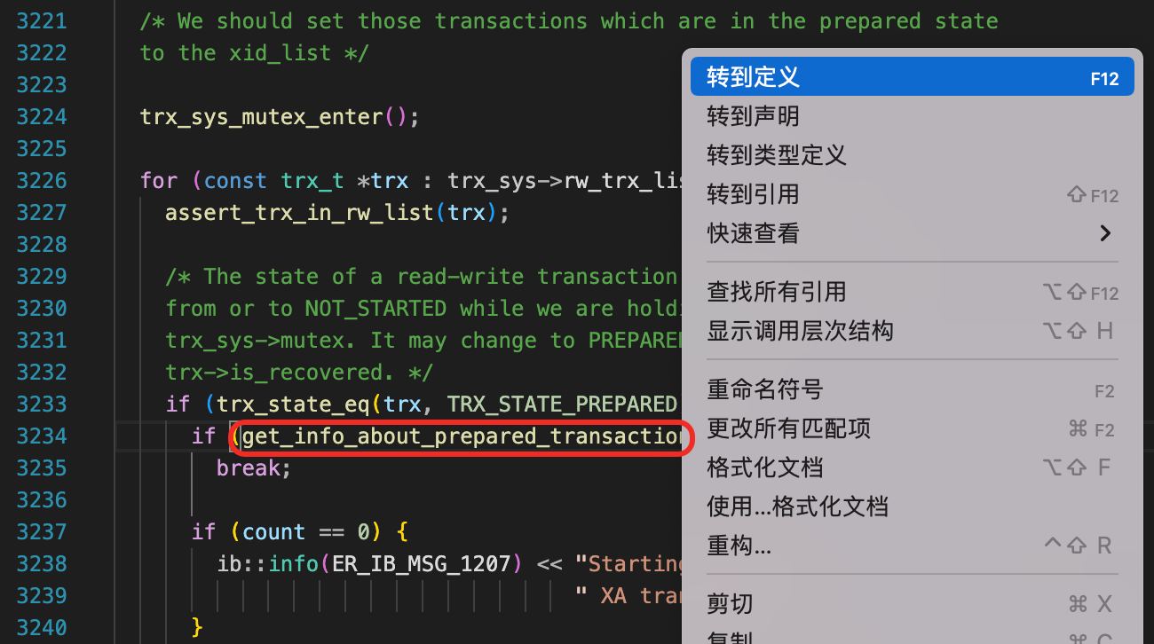 接下来就使用VSCode,来分析下数据库崩溃恢复时,怎么处理Prepared状态的事务。[35 讲]中的“二阶段提交”这一小节中,提到过Prepared状态的事务,在数据库启动时是提交还是回滚,取决于Binlog中是否存在对应的XID事件。