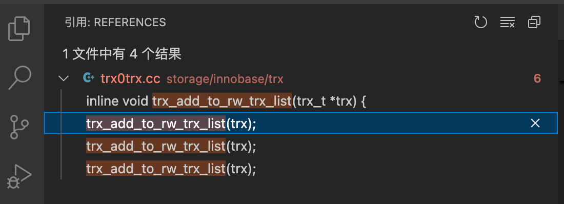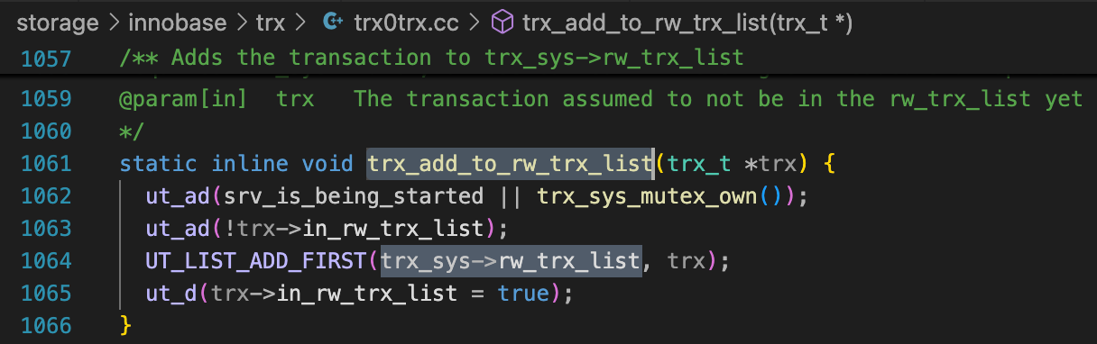那么数据库启动时,rw_trx_list里的数据是从哪里来的呢?使用查找功能(CMD + SHIFT + F)进行搜索,发现trx0trx.cc中有一处代码会往这个列表中插入数据(UT_LIST_ADD_FIRST)。