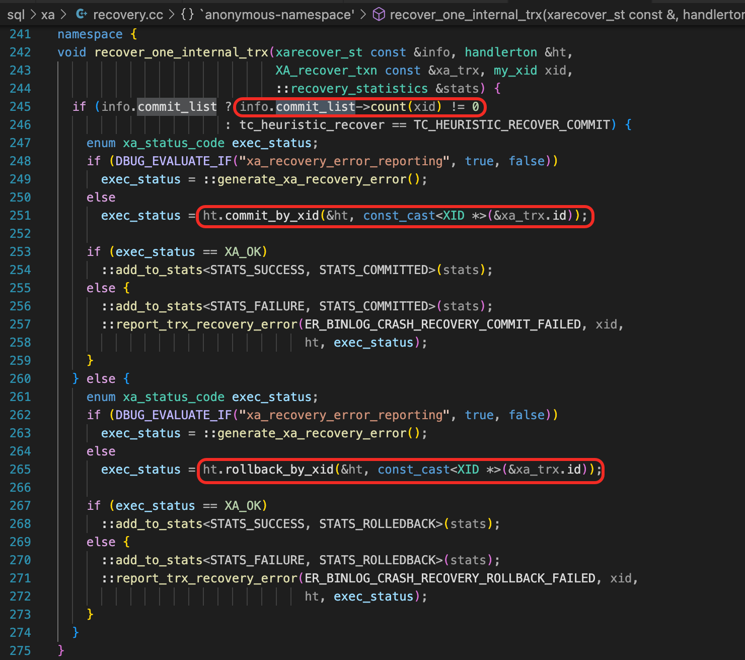 函数recover_one_internal_trx中,会判断info.commit_list中是否有当前处理的事务的XID,如果有,就执行ht.commit_by_xid提交事务,如果没有,就执行ht.rollback_by_xid回滚事务。