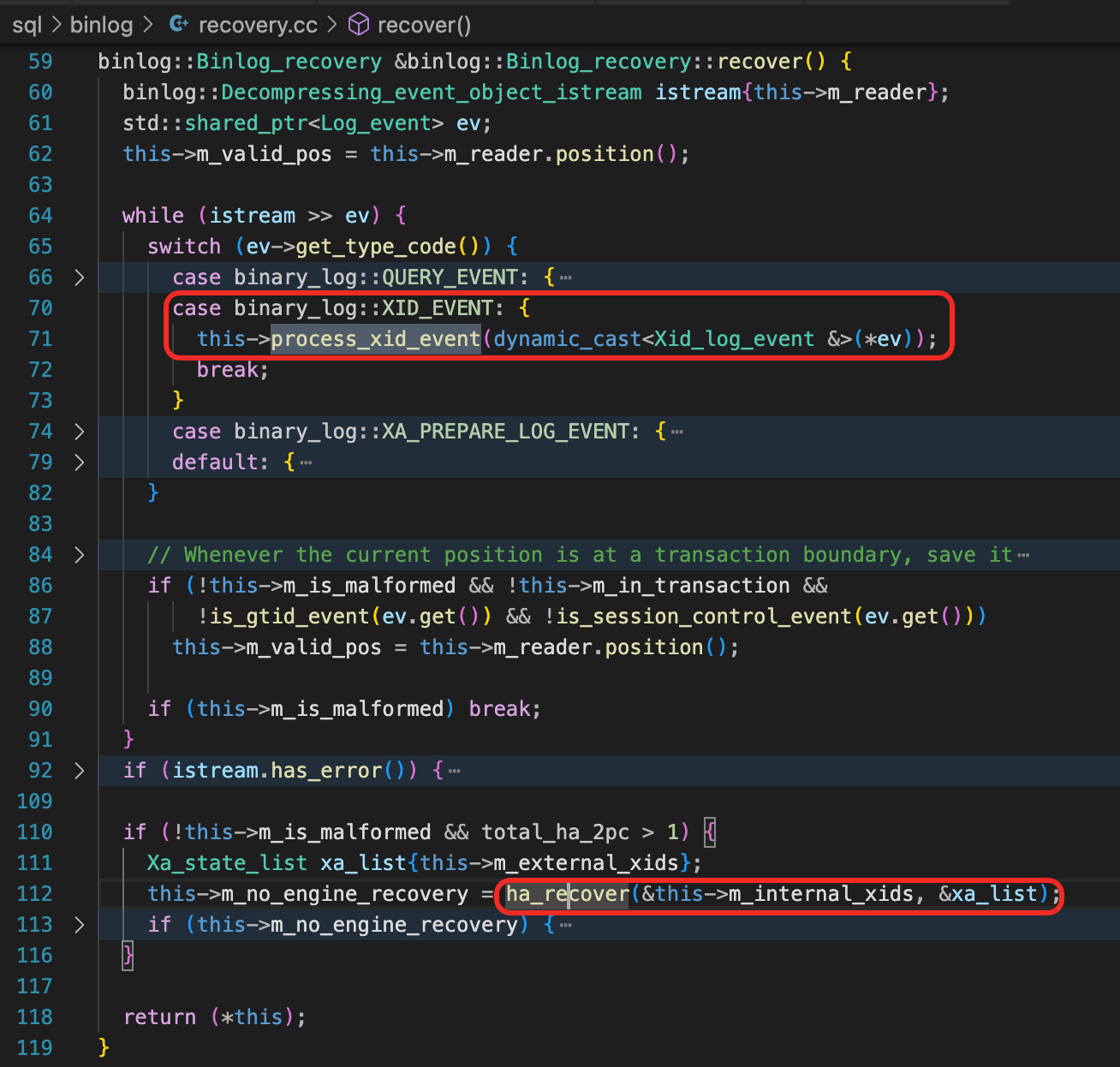 Binlog_recovery::recover函数中会调用process_xid_event。64行的循环中,读取Binlog文件中的每一事件,如果读取到一个XID事件,就把XID加到m_interal_xids中。