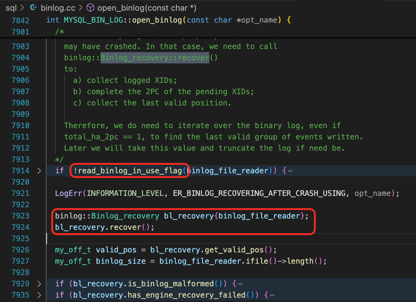 Binlog_recovery::recover在函数open_binlog中调用。open_binlog判断当前的Binlog是不是数据库崩溃时在使用的,这实际上是根据Binlog头部的FORMAT_DESCRIPTION_EVENT事件中,是否有LOG_EVENT_BINLOG_IN_USE_F标记来判断的。如果有这个标记,就执行Binlog_recovery::recover,读取Binlog中的所有XID,调用ha_recover处理Prepared状态的事务。