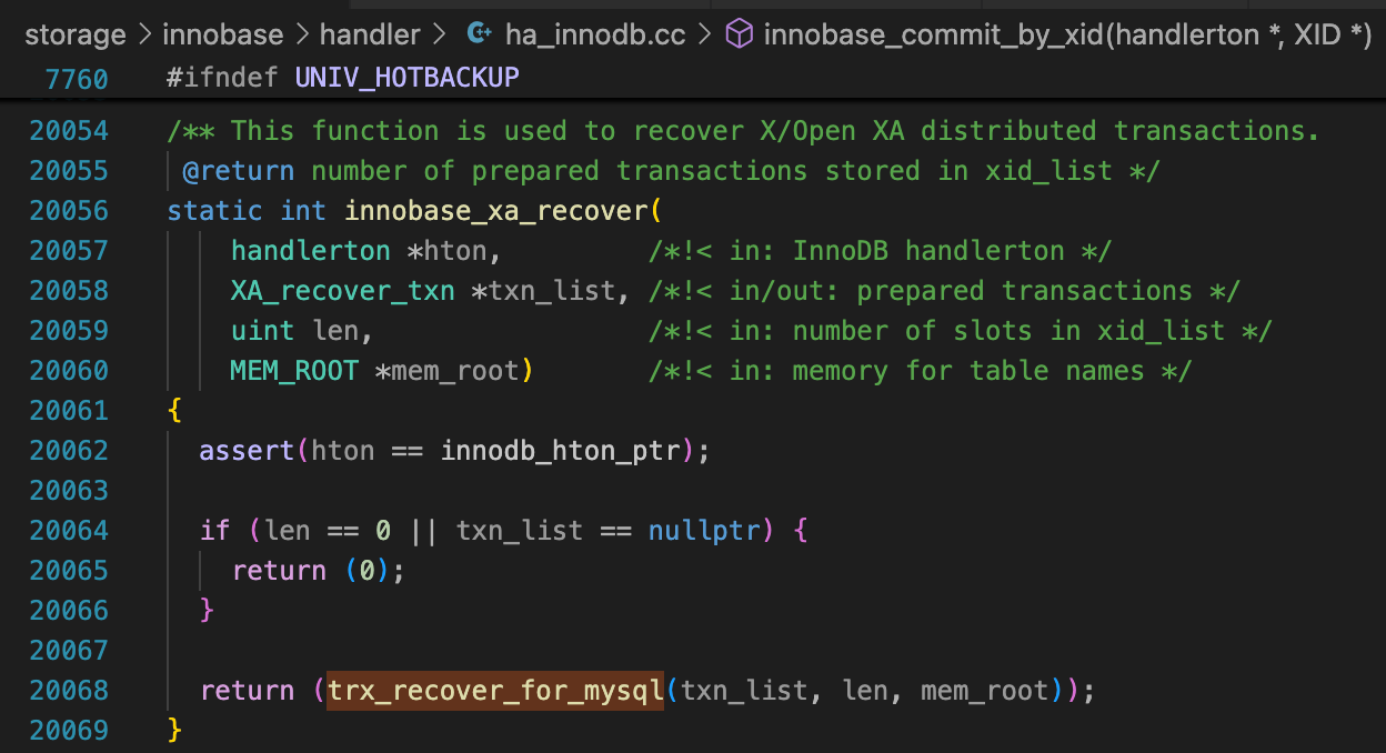 谁调用了innobase_xa_recover呢?你会发现代码中并没有直接调用这个函数。但是innodb_init中,这个函数赋值给了innobase_hton->recover这个函数指针。执行innobase_hton->recover时,实际上就是在执行innobase_xa_recover。