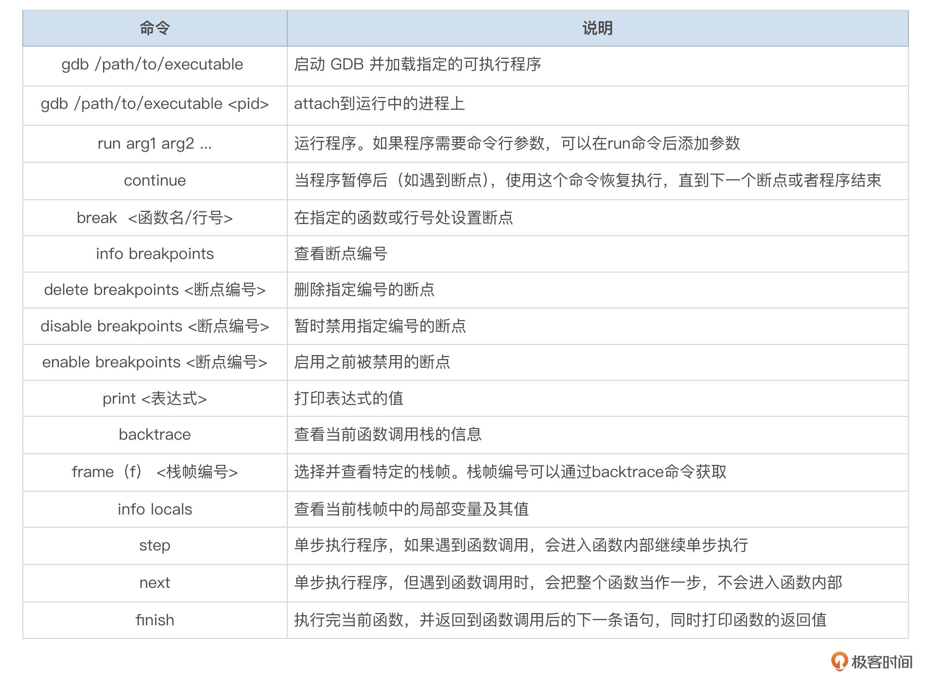 gdb的功能很强大,我把一些基本的命令整理到了下面这个表格中。可以使用命令的简称,比如执行c就是执行continue命令。