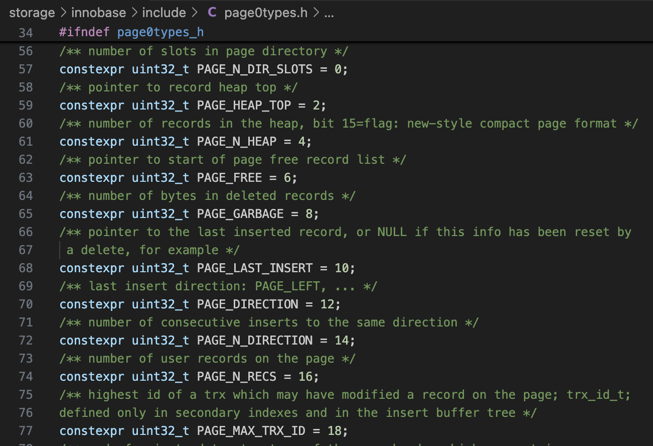 在代码里搜索这里定义的常量,能很快找到使用这些常量的代码,就能理解这些字段的作用。比如搜索PAGE_HEAP_TOP,看到函数page_mem_alloc_heap中会写入这个字段(page0page.cc 243行)。