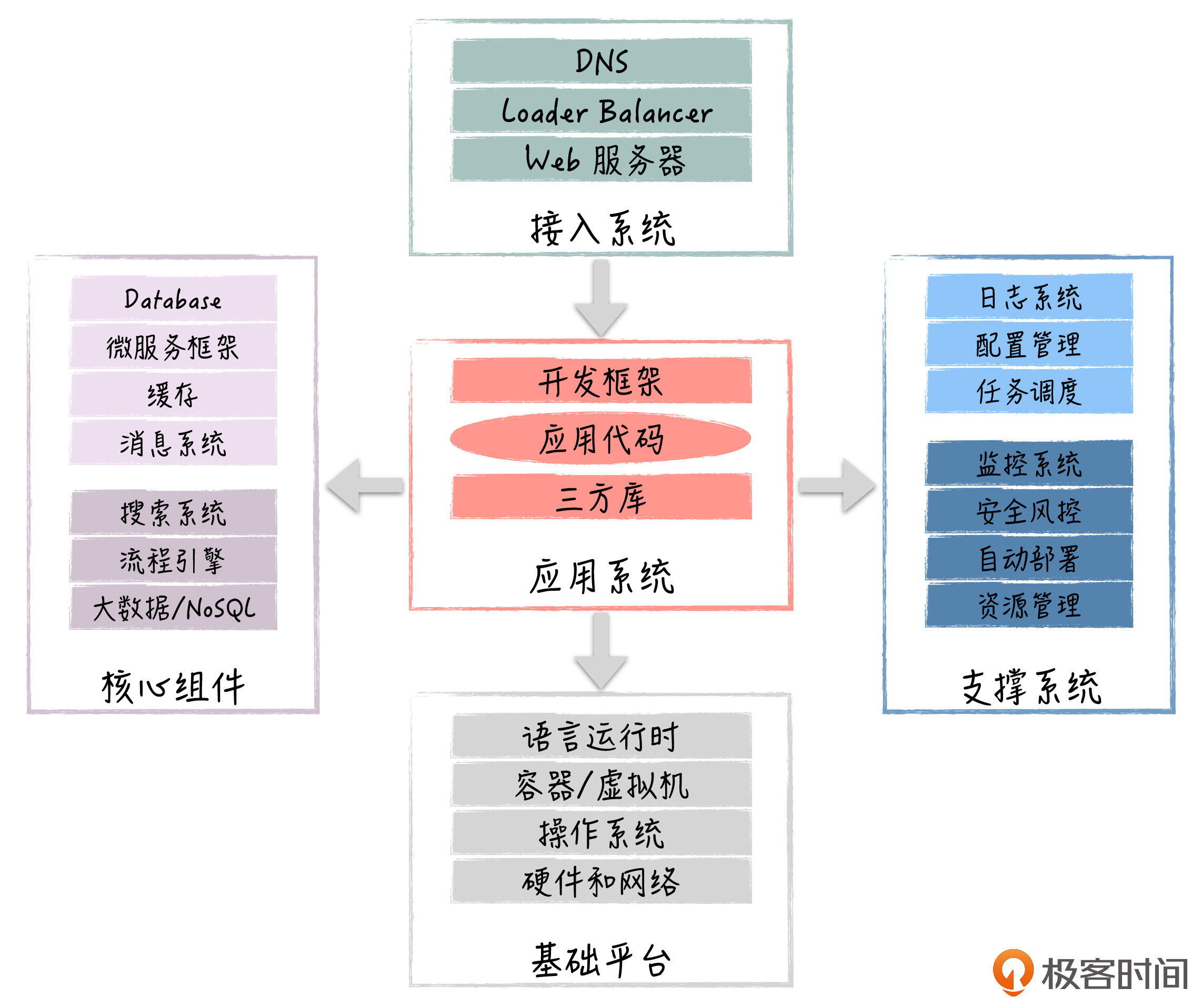 除此之外,还有大量周边的支撑系统在支持应用的正常运行,包括日志系统、配置系统,还有大量的运维系统,它们提供监控、安全、资源调度等功能,它们和核心组件的区别是,这些系统一般不参与实际的用户请求处理,但它们在背后默默保障系统的正常运行。