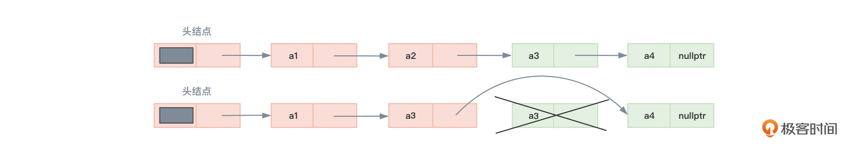 在实际的应用中,往往我们也会涉及到删除某个指定节点的情况。传统的做法是必须要利用头指针m_head从前向后找到这个被删除节点的前趋节点。比如要将a2删除,就要先从前向后找到a1节点,算法的平均情况时间复杂度为O(n)。