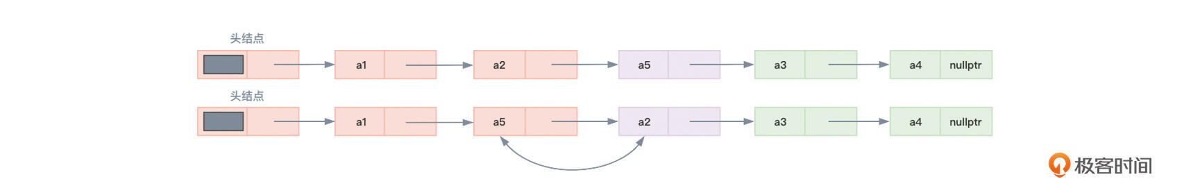 你看,最终也可以达到将a5插入到a2之前的效果,而且这样修改后的算法时间复杂度为O(1)。