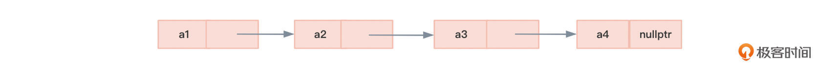 而右侧单链表中存储的元素在内存中并不需要紧密相连。在单链表中,每个节点不但用于存放一个数据元素(数据域),还要额外存放一个用于指向后继节点的指针也称后继指针(指针域),最后一个节点的指针域指向nullptr。
