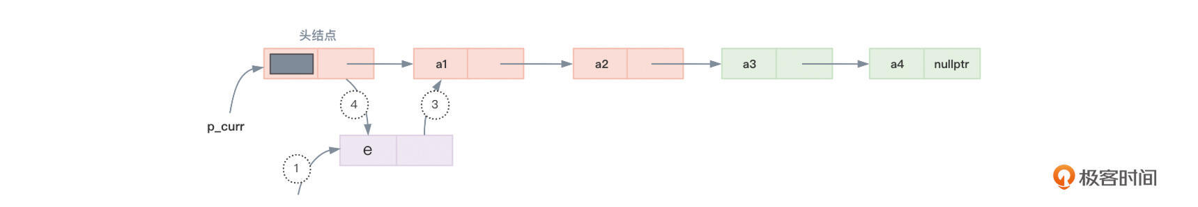 在上面的代码中,我们要重点关注前面增加了数字的代码行,其中的①、③、④行涉及到了新节点的创建以及修改新老节点的指向,那么这些行对应的节点指向示意图要怎么画呢?