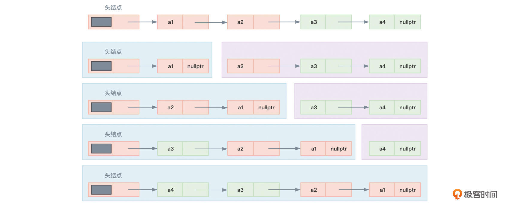 图8展示了翻转单链表的步骤,先将头结点和a1分到一起作为第一部分,将a2、a3、a4分到一起作为第二部分,然后摘取第二部分的首部节点a2插到第一部分的a1之前,再摘取第二部分的首部节点a3插入到第一部分的a2之前……最终就可以实现整个单链表的翻转。