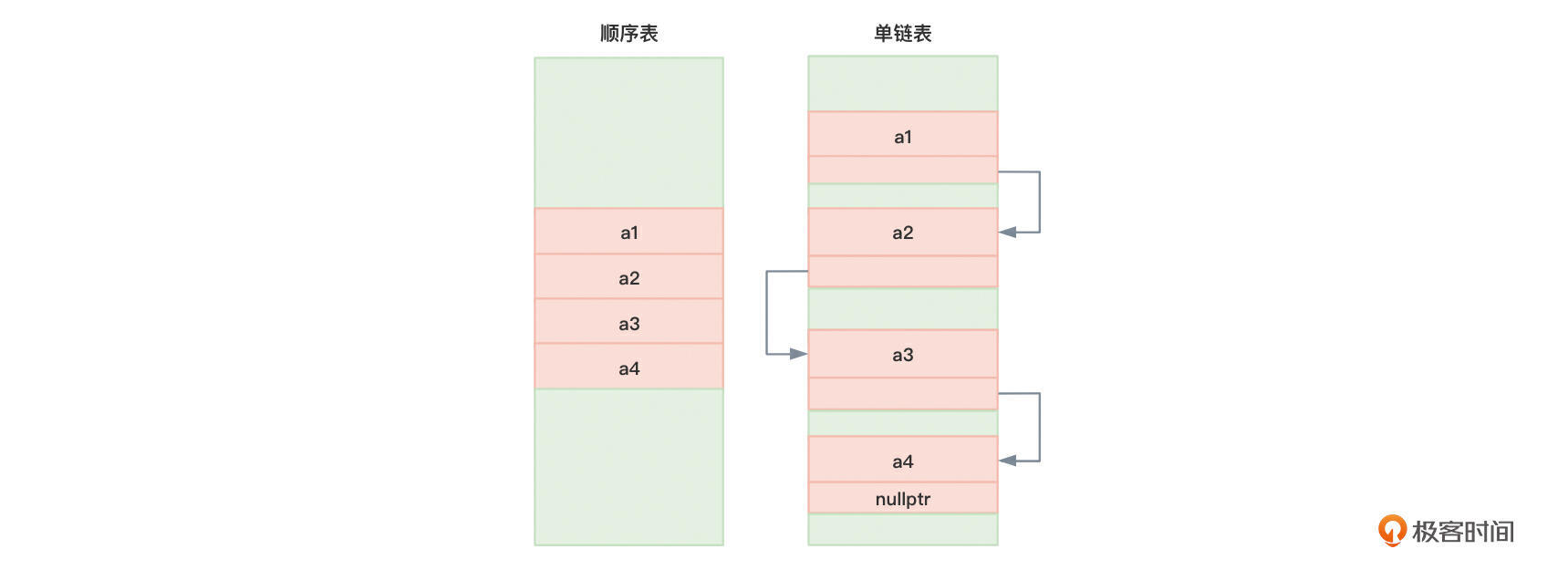 图1展示了顺序表与单链表保存数据元素的区别(左侧为顺序表,右侧为单链表)。